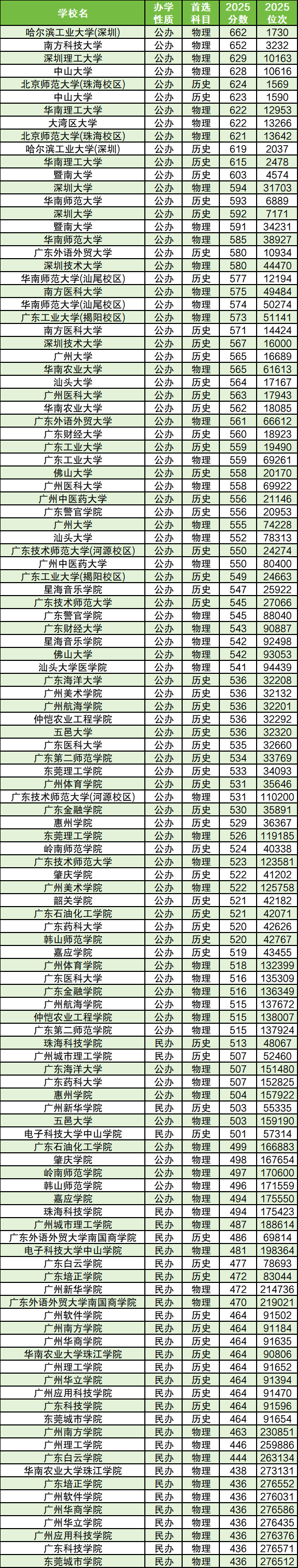参考2025年广东录取数据,广东物理组本科各大学录取分数线最高的是:哈尔滨工业大学(深圳),2025年最低分数线是662分,位次排名是1730位。