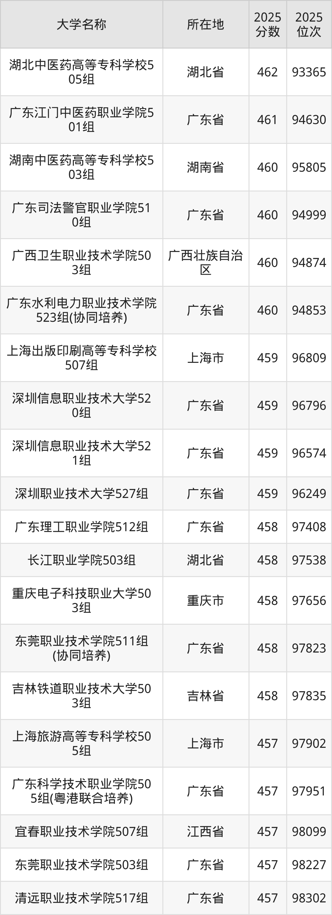 广东高考历史类最低位次在97000名附近的院校专业组中,其中有9所位于广东省内,分别为:广东江门中医药职业学院、广东司法警官职业学院、广东水利电力职业技术学院、深圳信息职业技术大学、深圳职业技术大学、广东理工职业学院、东莞职业技术学院、广东科学技术职业学院、清远职业技术学院。