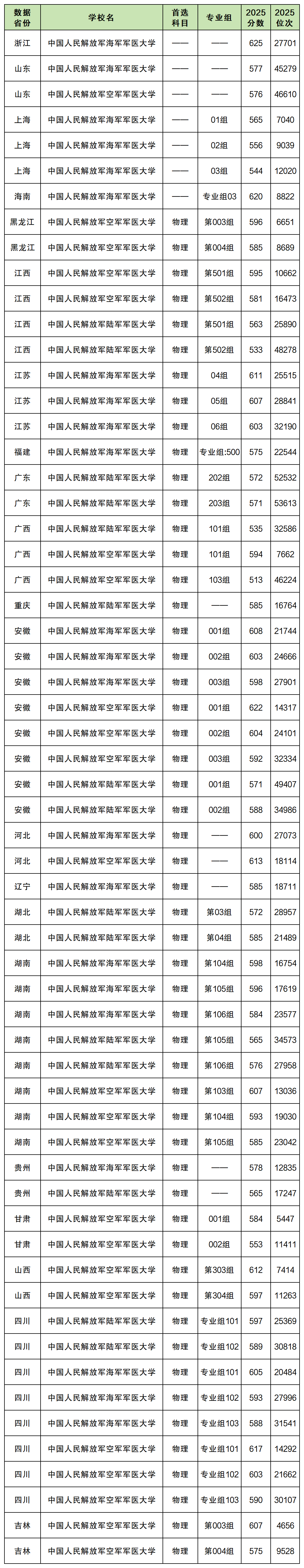 2025年海军军医大学在北京,男生最低605分,女生最低625分;