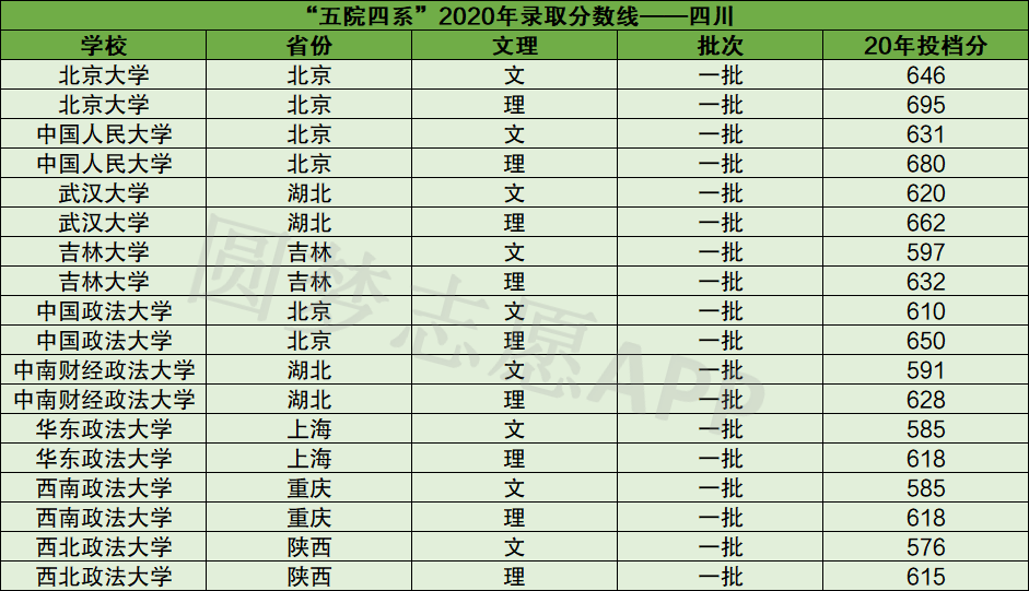 由于9所学校相关数据太多,所以本文仅挑选河南、四川两个高考大省为例,用以参考五院四系2020年的录取分数线情况。