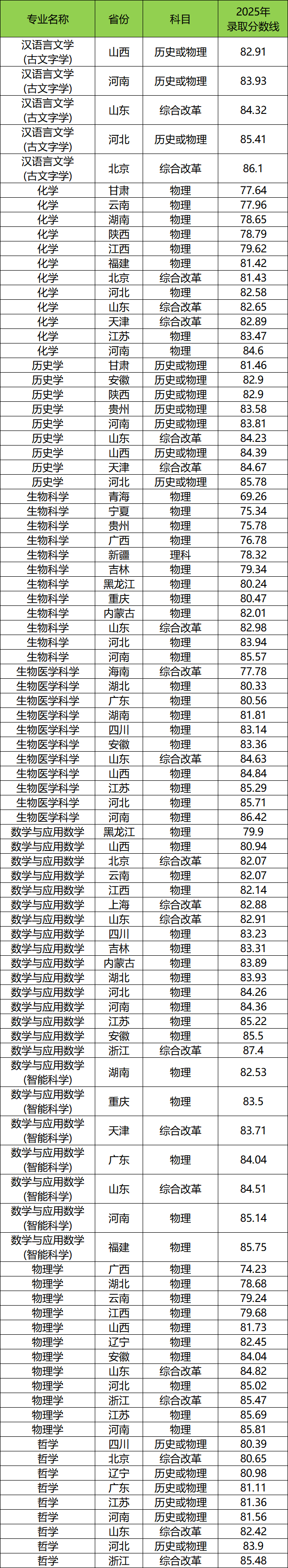 2025年山东大学强基计划录取分数线整体位于77.96到86.42分之间,录取分数最低是在云南(化学专业)、分数最高是在河南(生物医学科学专业)。