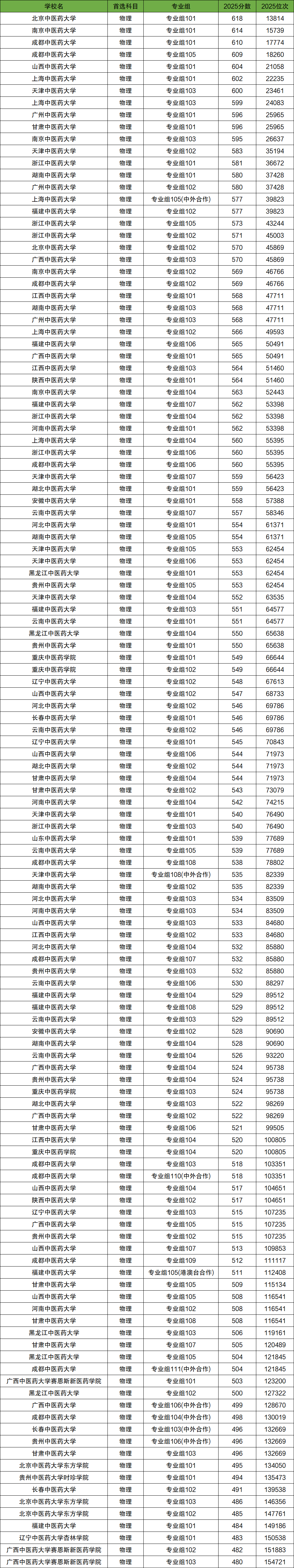 2025年四川物理类中医药大学院校分数线排名一览表如下: