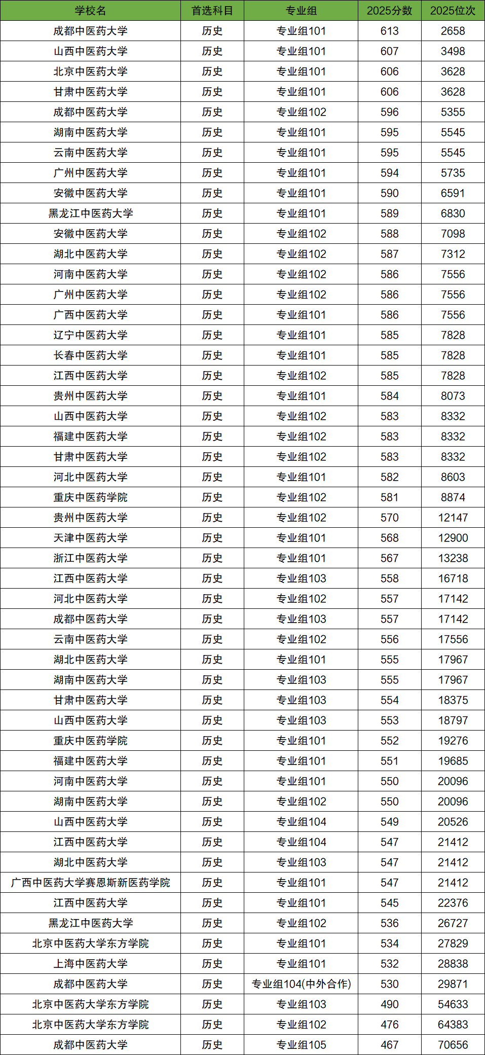 2025年四川历史类中医药大学院校分数线排名一览表如下: