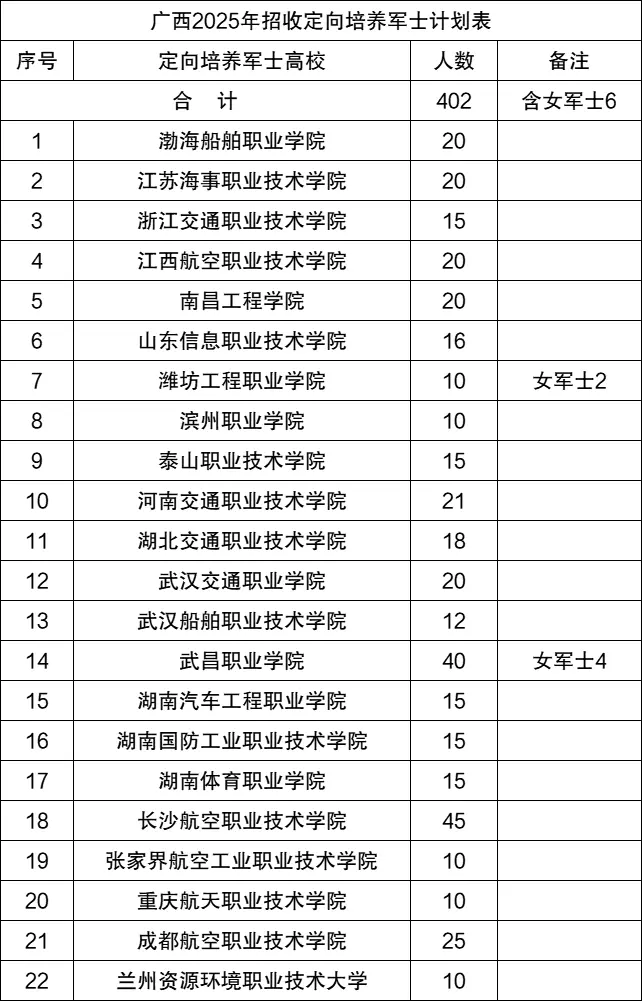 2025年在广西招生的定向士官院校共计22所,包括武昌职业学院、江苏海事职业技术学院、南昌工程学院等,完整名单如下: