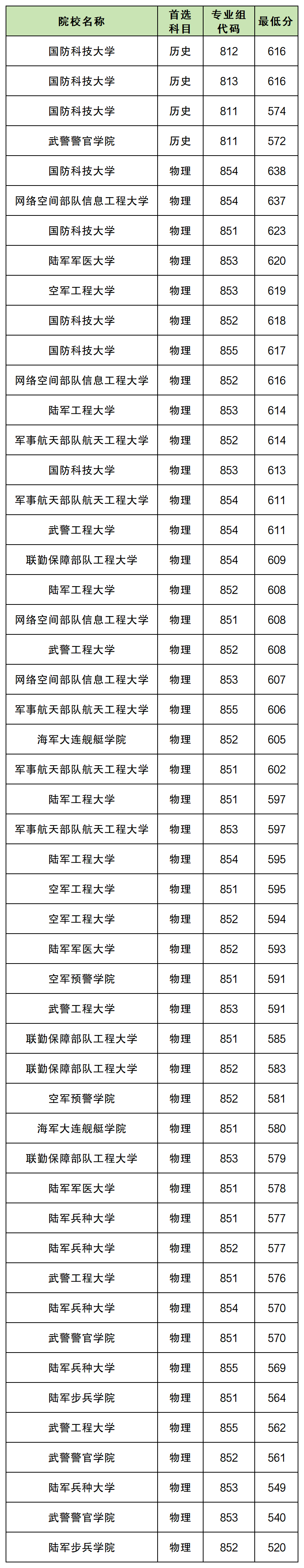 物理类:最低520分,对应陆军步兵学院852组。