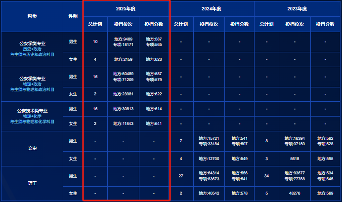 2025年中国刑事警察学院在吉林录取最低分:历史类589分、物理类622分。其中历史类男生最低589分(侦查学)、女生最低630分(公安情报学);物理类男生最低622分(涉外警务)、女生最低631分(侦查学)。