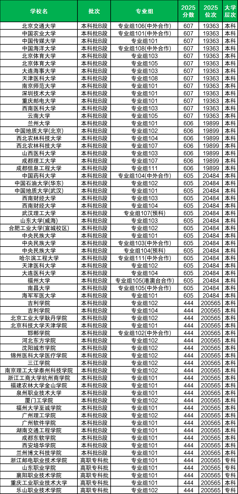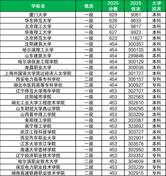 注:下方为2025年各省物理类本、专科大学最低录取位次,且部分本科院校会招收专科生,因此有的位次较低。