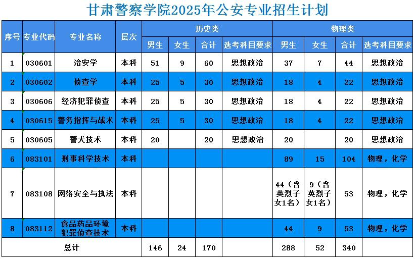 甘肃警察学院2026年招生专业预计如下,其中报考公安专业的考生均需通过政治考察、面试、体检和体能测评: