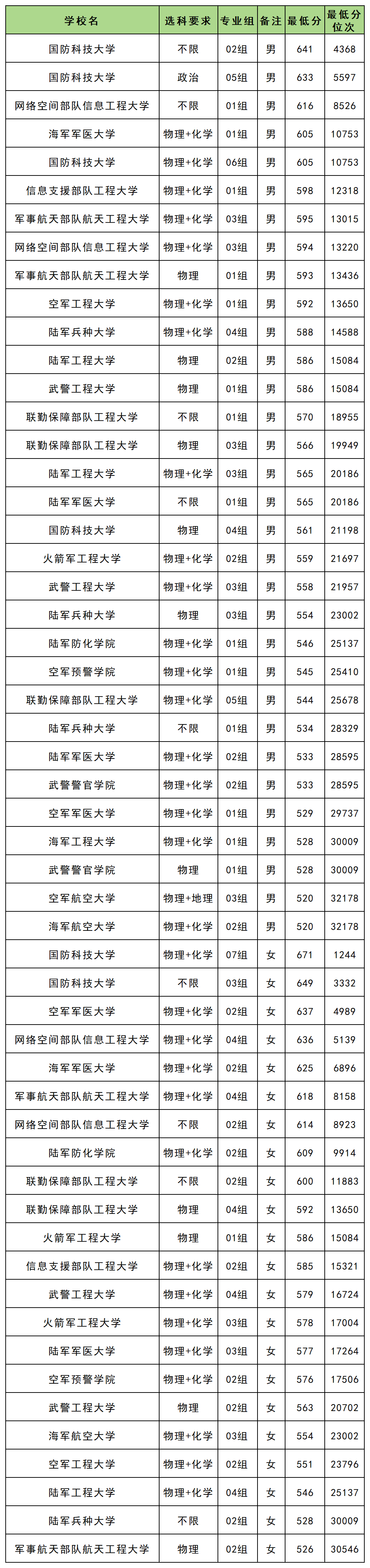 2025年军校在北京提前批的录取分数线为:男生520分-641分、女生526分-671分。