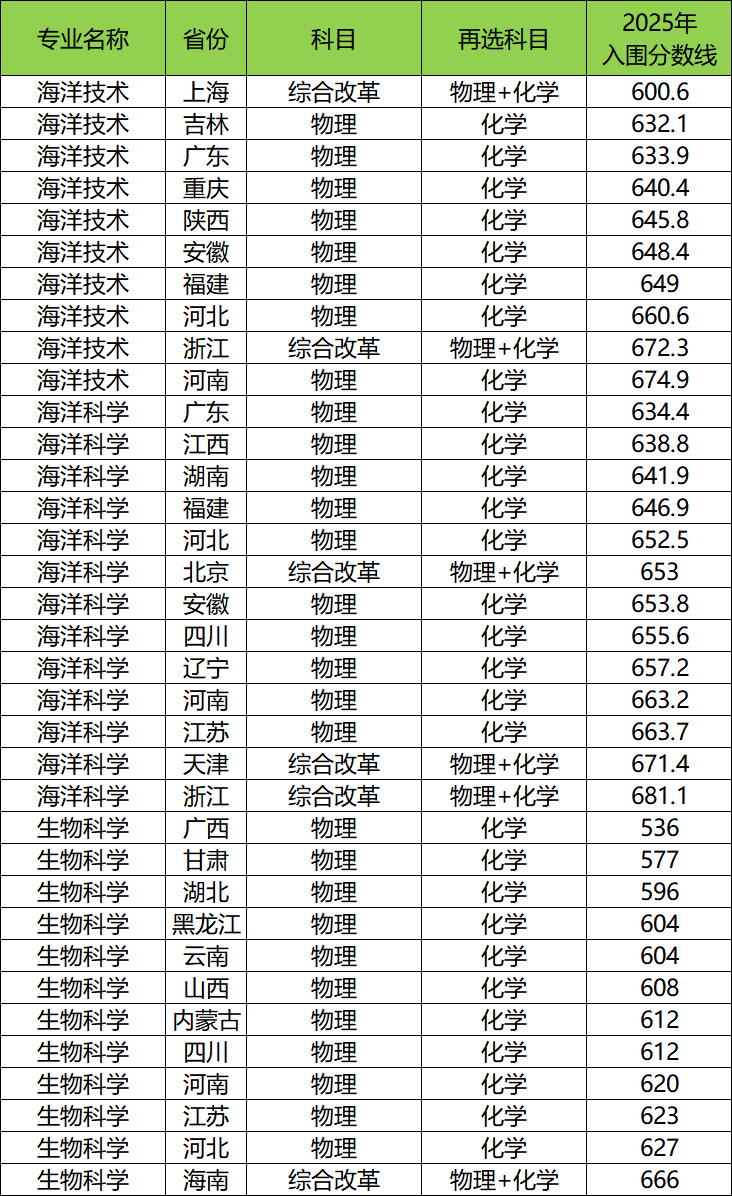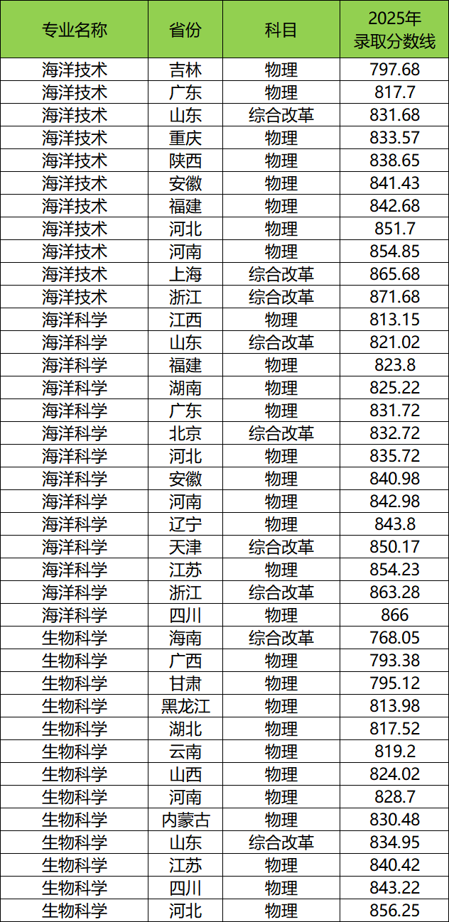 海洋科学:山东821.02分、河北835.72分、安徽840.98分、河南842.98分、辽宁843.8分等;