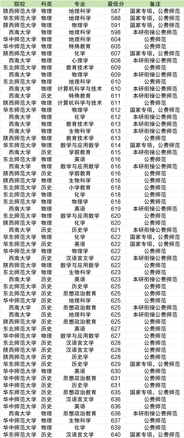 最低分的公费师范生院校及专业是陕西师范大学的地理科学专业,录取分数线为587分。