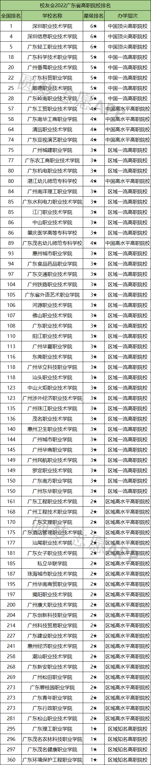 深圳职业技术学院、深圳信息职业技术学院、广东轻工职业技术学院、广东科学技术职业学院、广州番禺职业技术学院、广东科贸职业学院、顺德职业技术学院、广东岭南职业技术学院、广东工贸职业技术学院、广东南华工商职业学院。