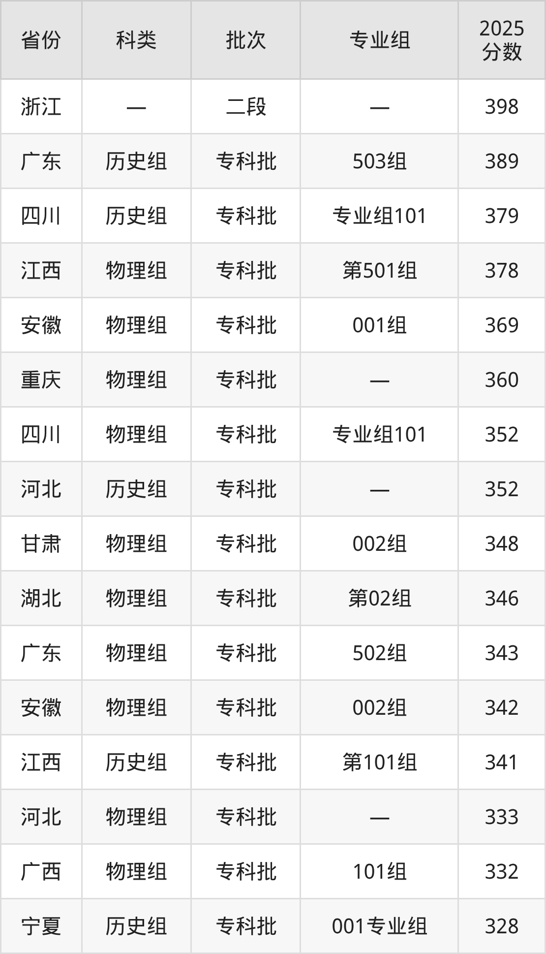 而浙江地区考生的分数门槛最高,2025年贵州电子信息职业技术学院在浙江招生最低分为398分,考生至少要超二段线130分才有可能被录取。