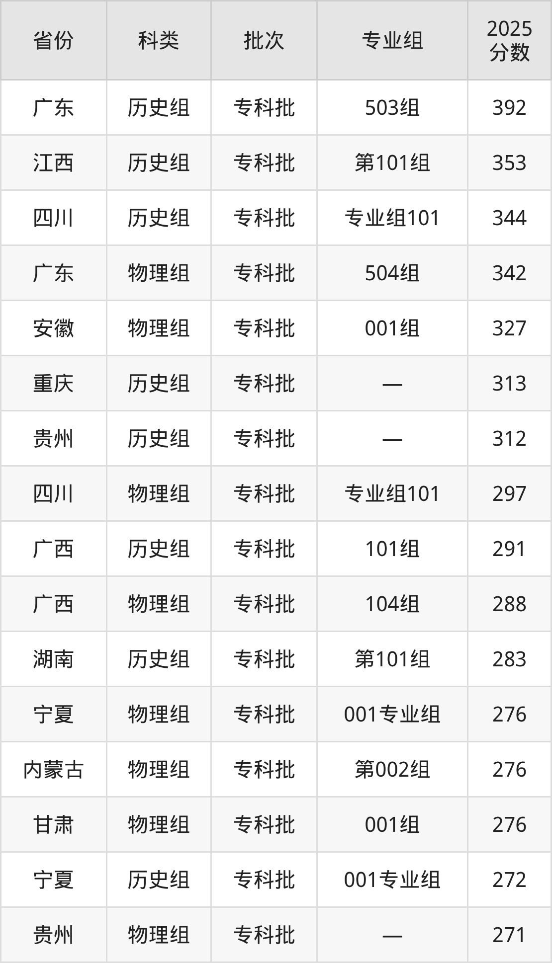 而广东地区历史组考生的分数门槛最高,2025年桂林生命与健康职业技术学院503组在广东招生最低分为392分,考生至少要超专科线177分才有可能被录取。