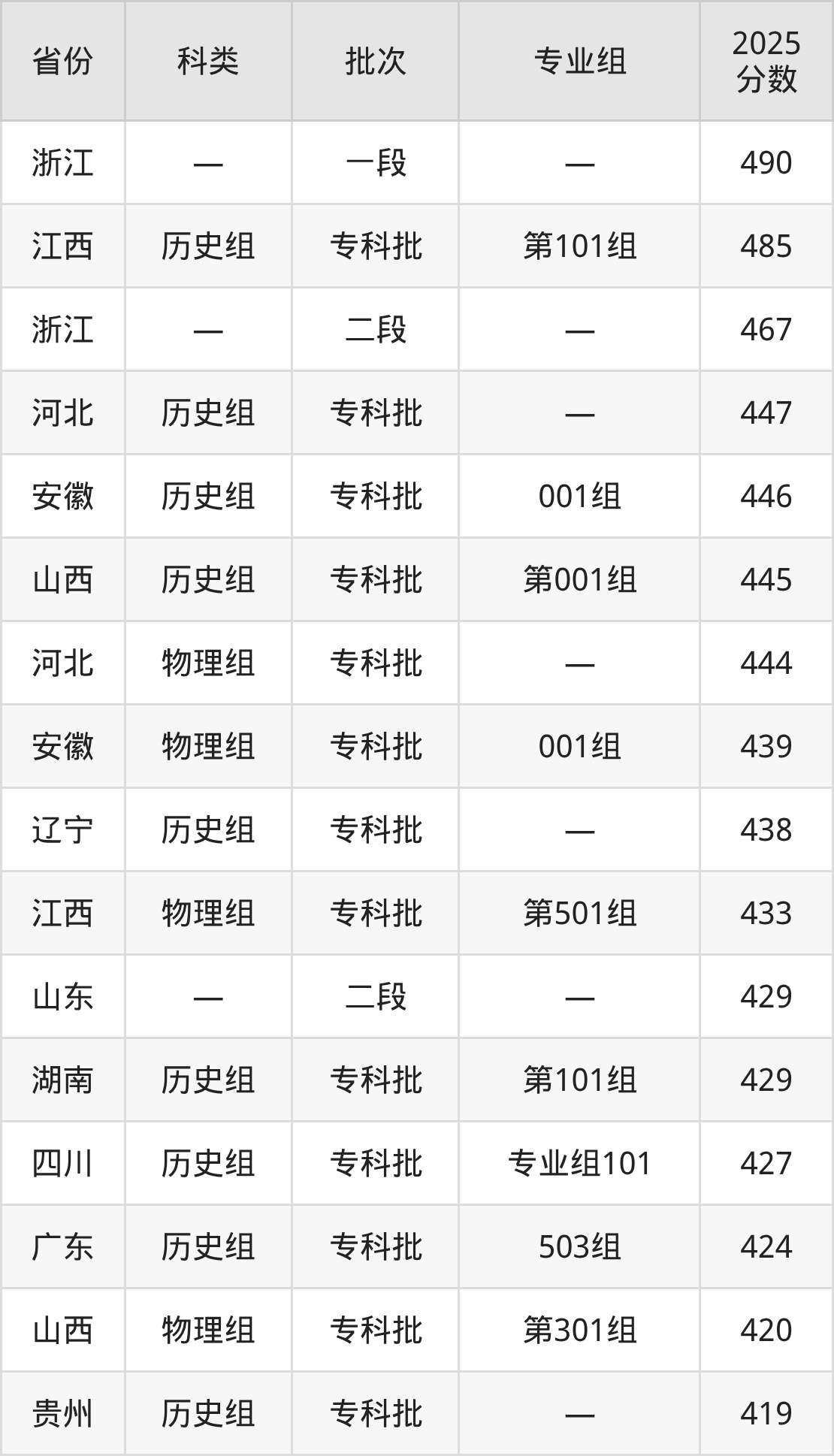 而浙江地区考生的分数门槛最高,2025年湖北铁道运输职业学院在浙江招生最低分为490分,考生至少要超一段线0分才有可能被录取。