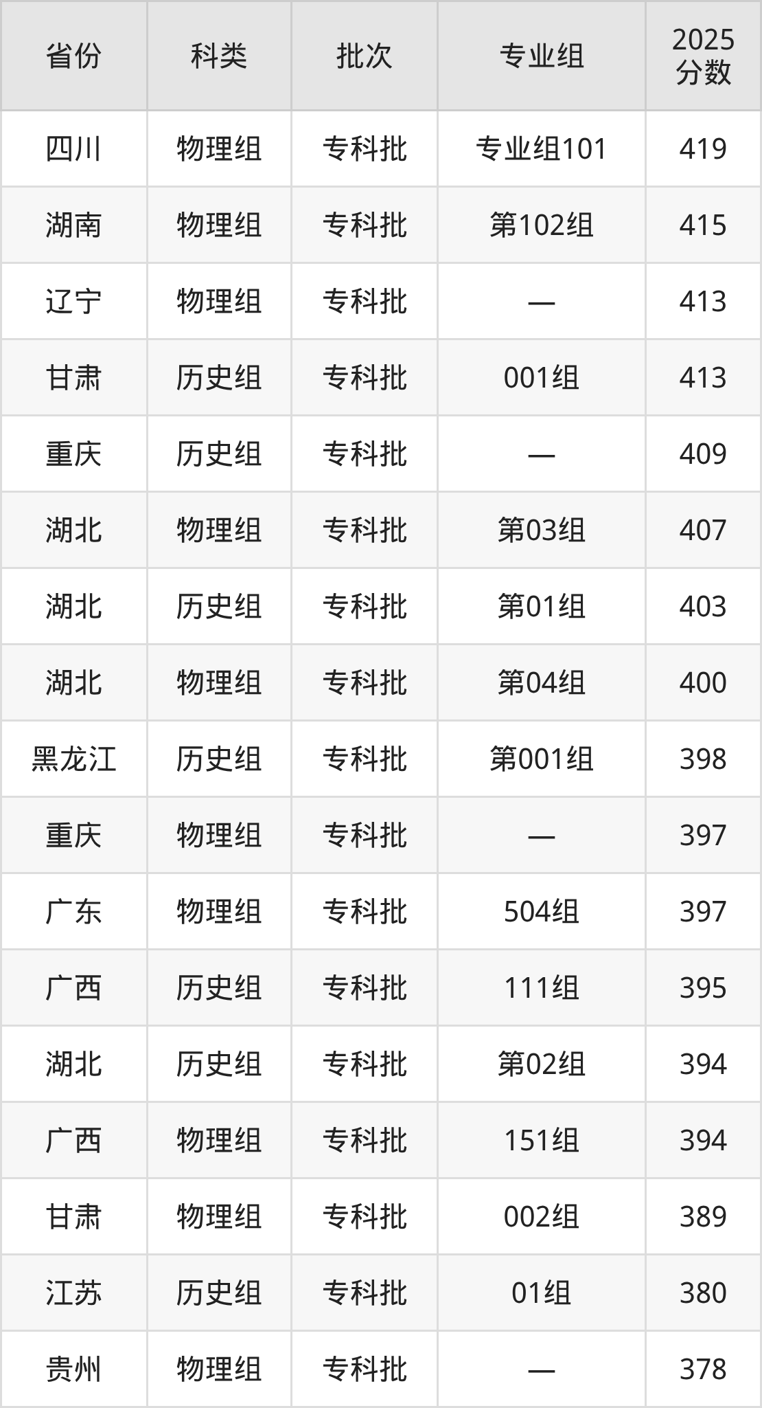 2025年湖北铁道运输职业学院在全国普通批次招生的录取分数范围位于365~490分之间,其中省内分数范围为394分~407分,物理组最低分专业组为“第04组”,考生400分即可报考,历史组最低分专业组为“第02组”,考生394分即可报考。