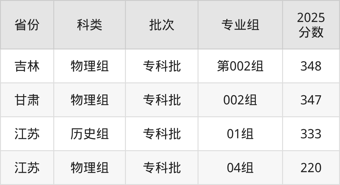 2025年江苏财会职业学院在全国普通批次招生的录取分数范围位于220~497分之间,其中省内分数范围为220分~497分,历史组最低分专业组为“01组”,考生333分即可报考,物理组最低分专业组为“04组”,考生220分即可报考。