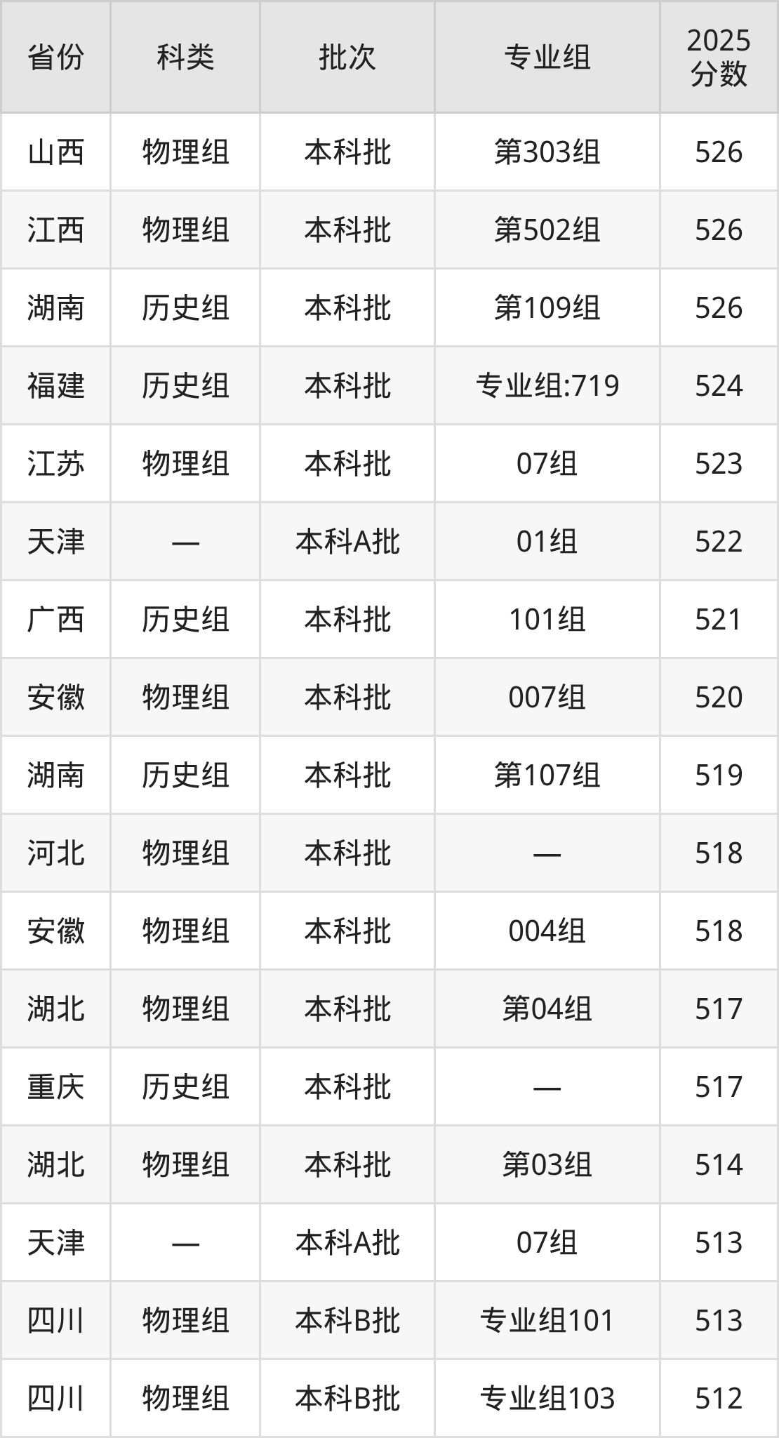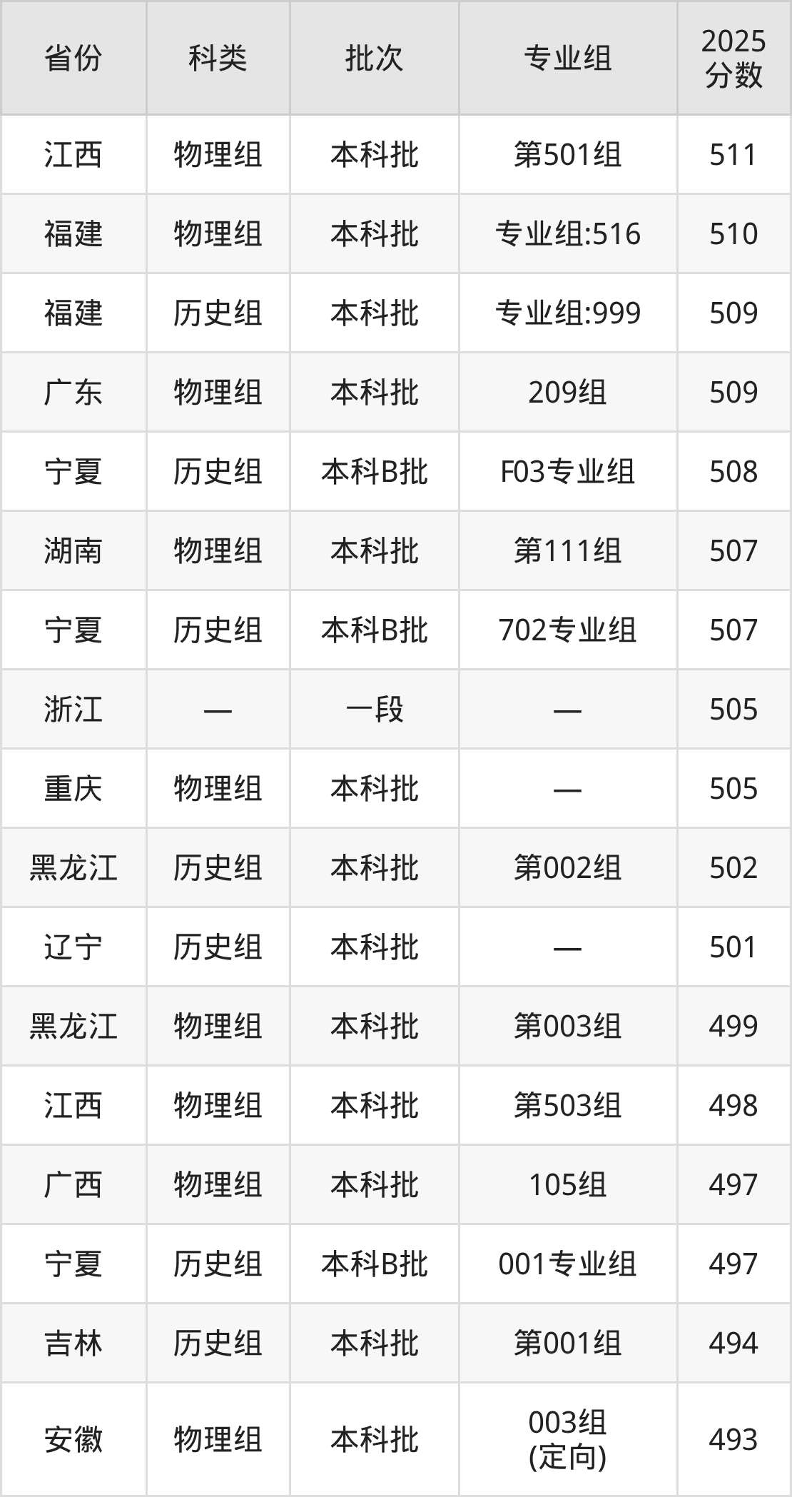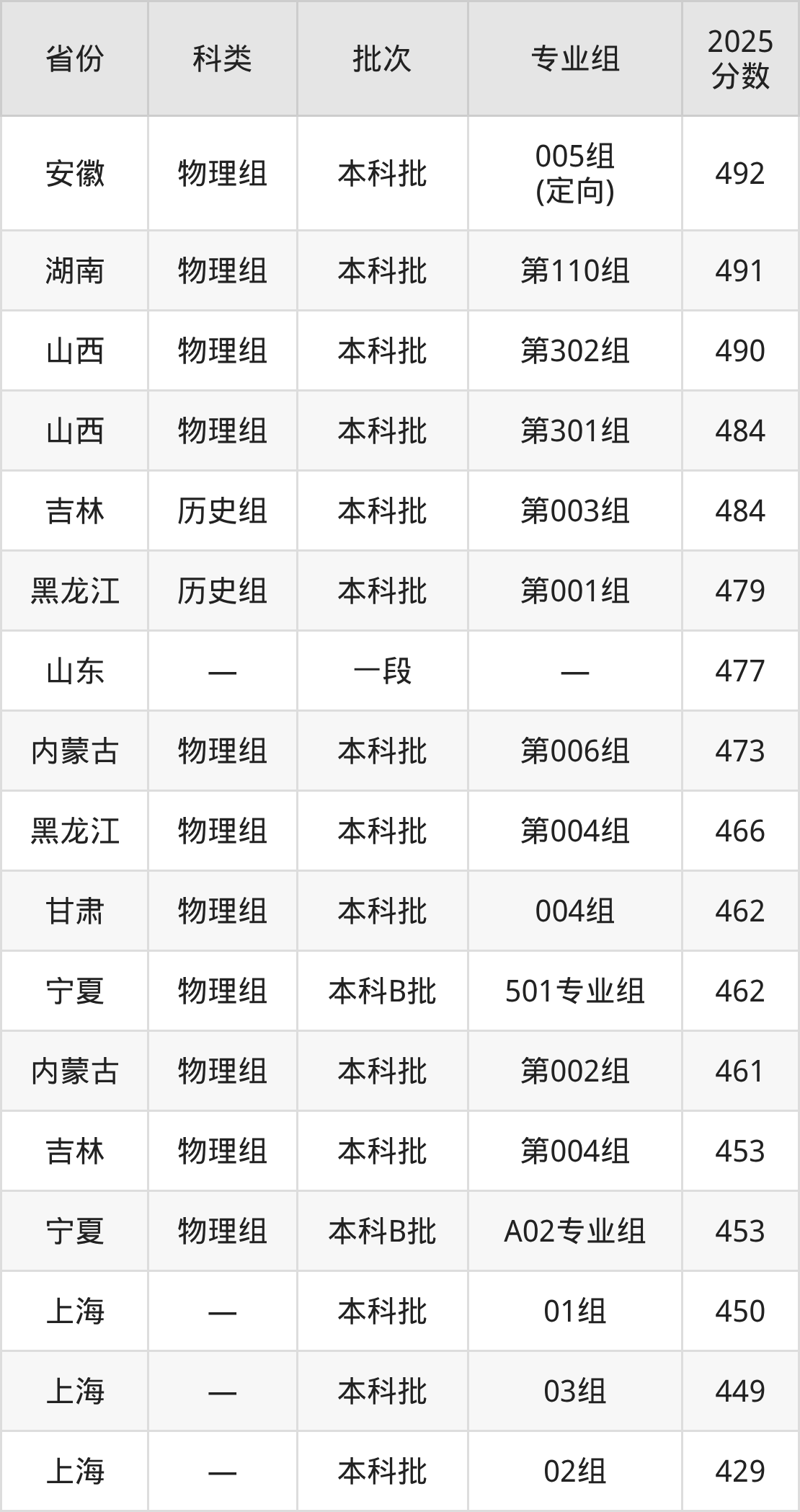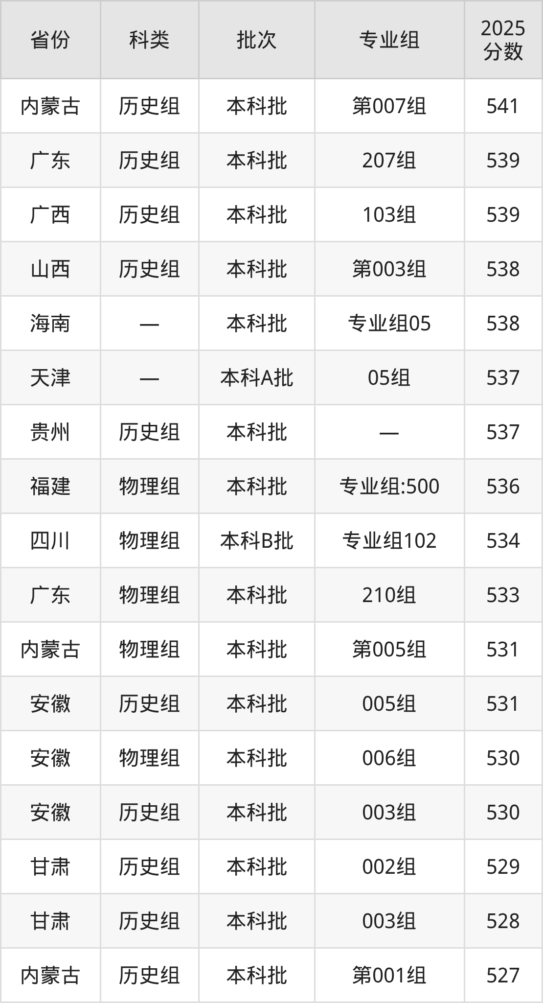 2025年淮北师范大学在全国普通批次招生的录取分数范围位于374~619分之间,其中省内分数范围为492分~544分,历史组最低分专业组为“003组”,考生530分即可报考,物理组最低分专业组为“005组(定向)”,考生492分即可报考。