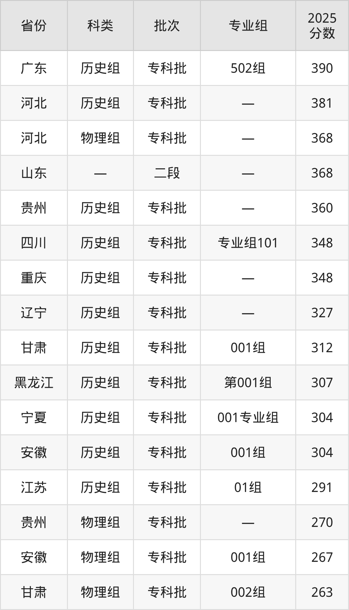 而广东地区历史组考生的分数门槛最高,2025年太原幼儿师范高等专科学校502组在广东招生最低分为390分,考生至少要超专科线175分才有可能被录取。