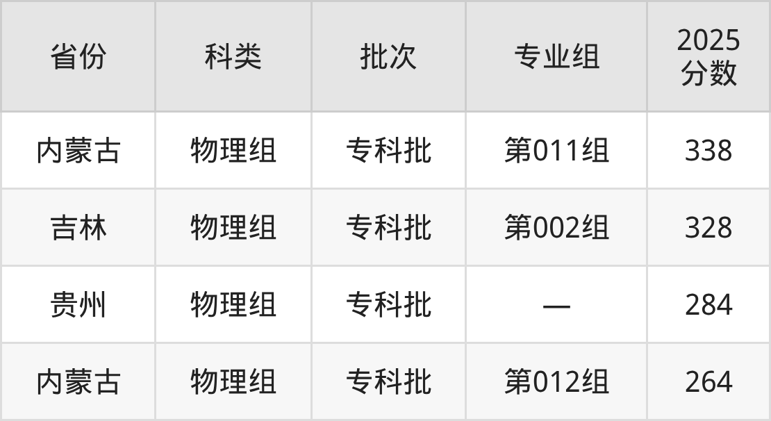 天津渤海职业技术学院在市外招生的最低分为264分,其中内蒙古地区物理组考生上天津渤海职业技术学院的分数门槛最低,考生成绩超专科线104分(264分)可上。其次是贵州物理组考生,上天津渤海职业技术学院至少要超专科线104分(284分)。