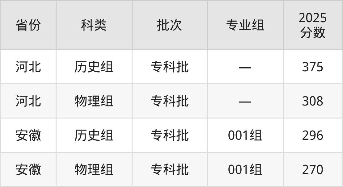2025年民办合肥经济技术职业学院在全国普通批次招生的录取分数范围位于270~375分之间,其中省内分数范围为270分~296分,历史组最低分专业组为“001组”,考生296分即可报考,物理组最低分专业组为“001组”,考生270分即可报考。