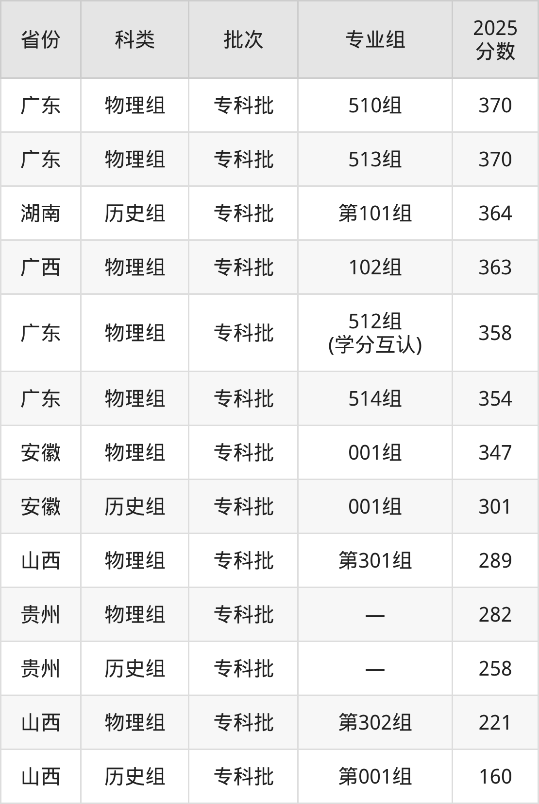 下面是河源职业技术学院2025年在全国各省的录取分数线一览表,供参考: