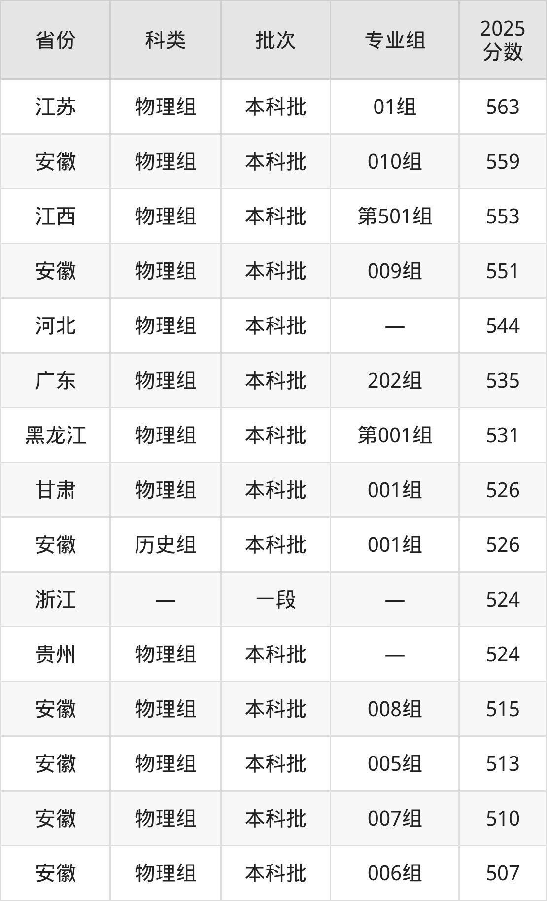 而江苏地区物理组考生的分数门槛最高,2025年皖南医学院01组在江苏招生最低分为563分,考生至少要超本科线100分才有可能被录取。