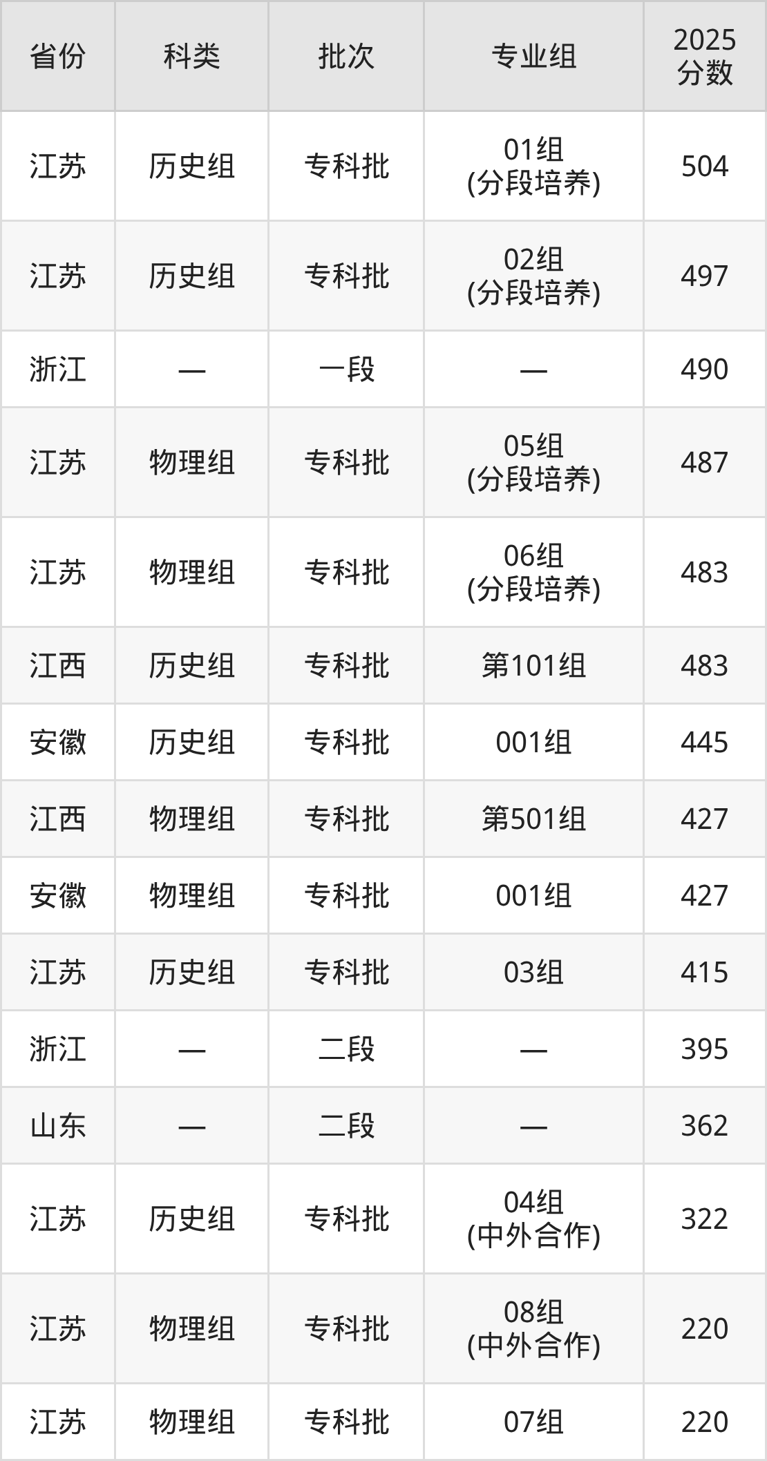 2025年江苏农林职业技术学院在全国普通批次招生的录取分数范围位于220~504分之间,其中省内分数范围为220分~504分,历史组最低分专业组为“04组(中外合作)”,考生322分即可报考,物理组最低分专业组为“08组(中外合作)”,考生220分即可报考。
