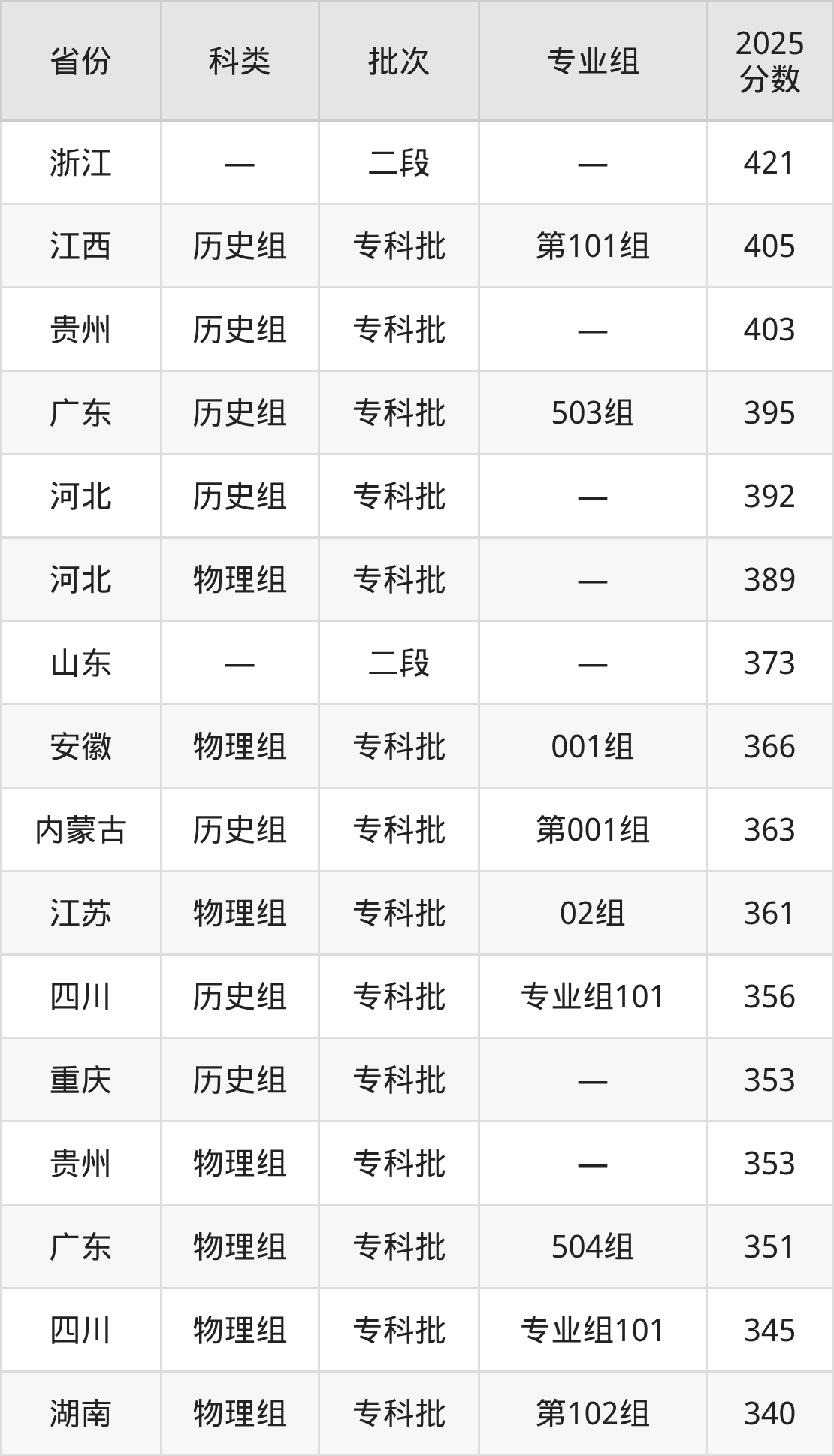 而浙江地区考生的分数门槛最高,2025年河南地矿职业学院在浙江招生最低分为421分,考生至少要超二段线153分才有可能被录取。