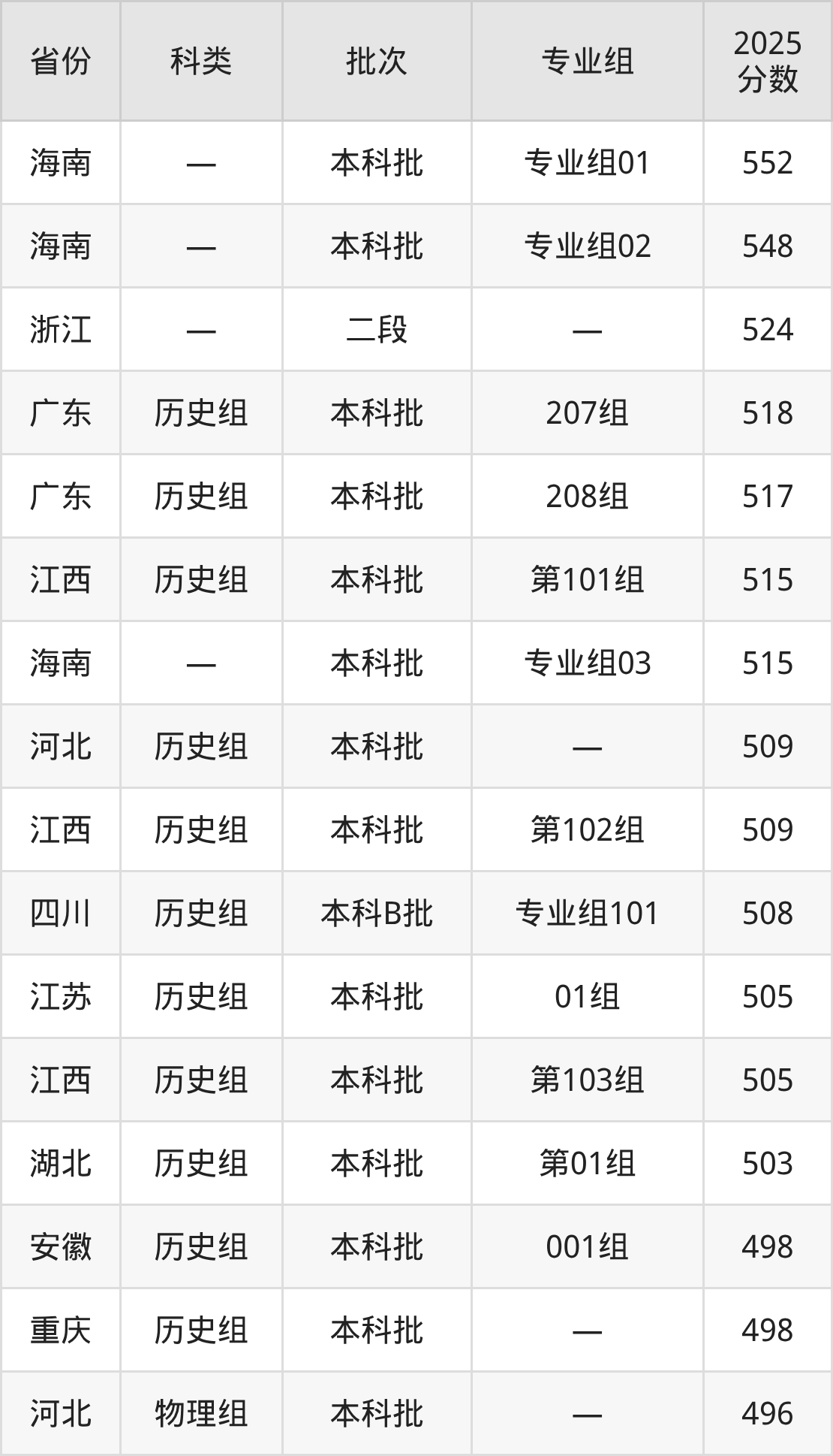 而海南地区考生的分数门槛最高,2025年江西财经大学现代经济管理学院专业组01在海南招生最低分为552分,考生至少要超本科线72分才有可能被录取。