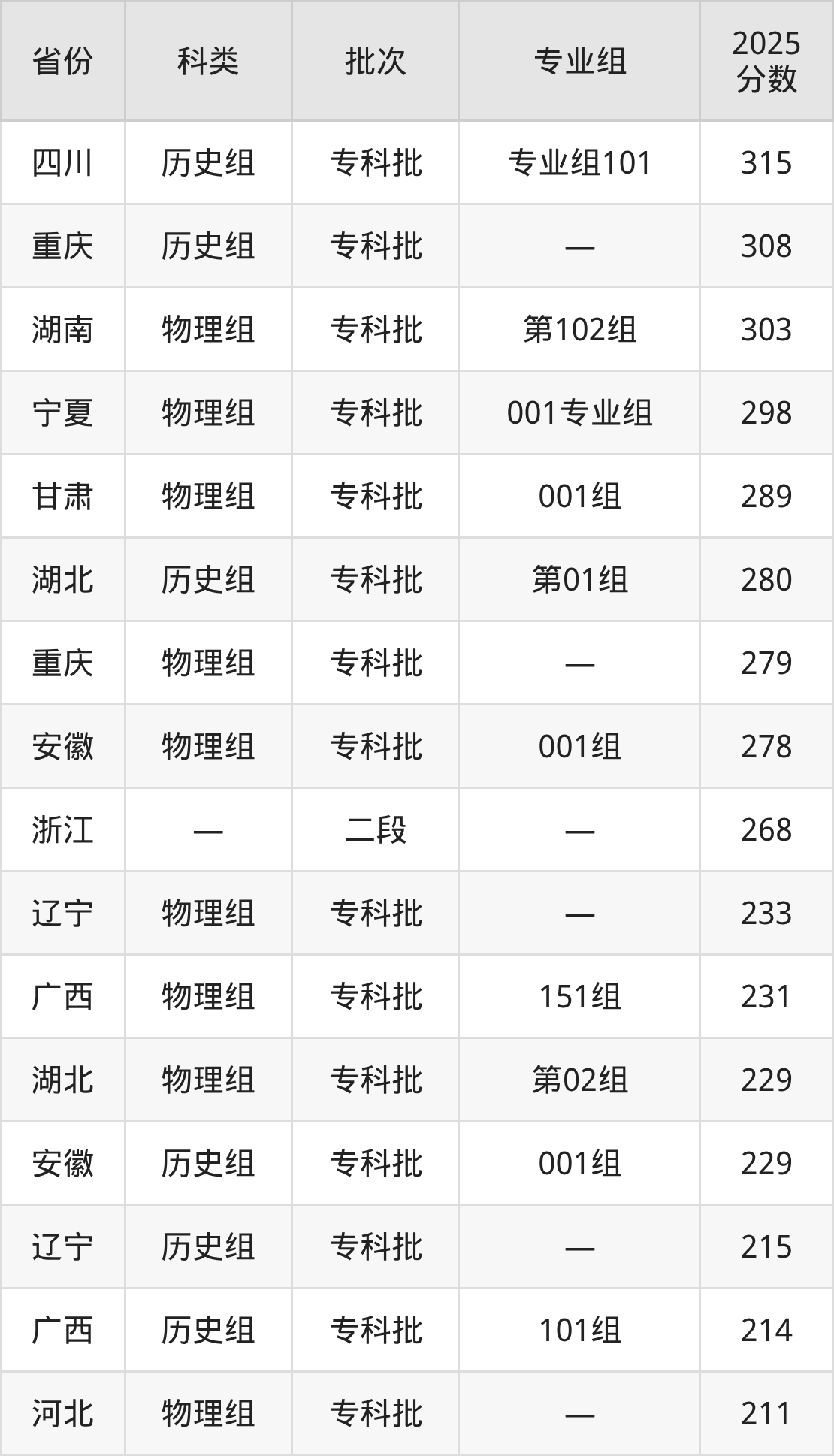 下面是重庆电信职业学院2025年在全国各省的录取分数线一览表,供参考: