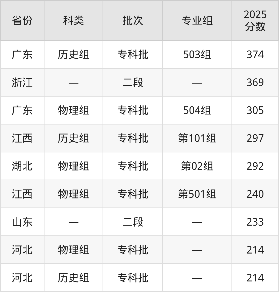 而广东地区历史组考生的分数门槛最高,2025年衡阳科技职业学院503组在广东招生最低分为374分,考生至少要超专科线159分才有可能被录取。