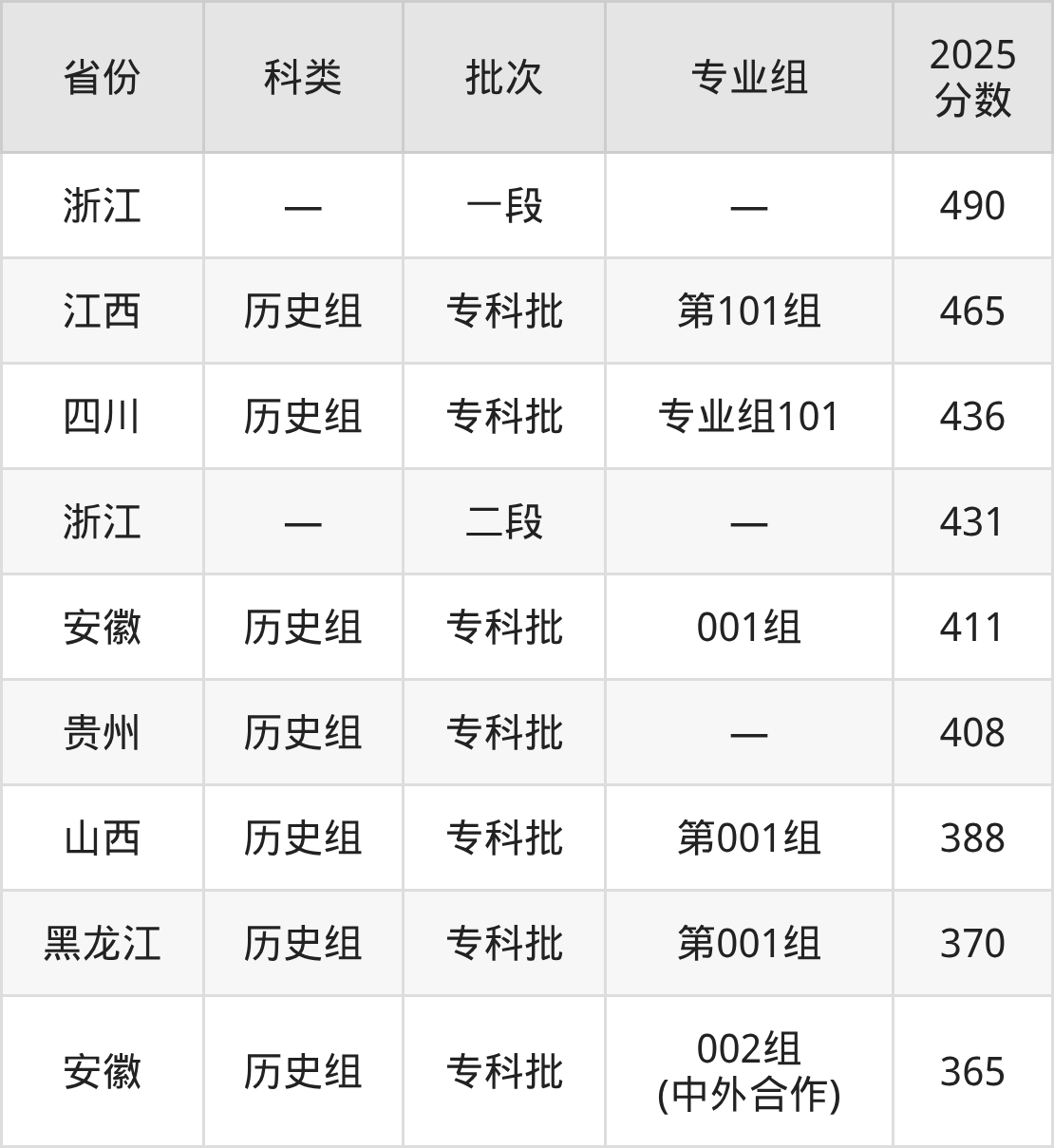 而江西地区历史组考生的分数门槛最高,2025年浙江纺织服装职业技术学院第101组在江西招生最低分为465分,考生至少要超专科线175分才有可能被录取。