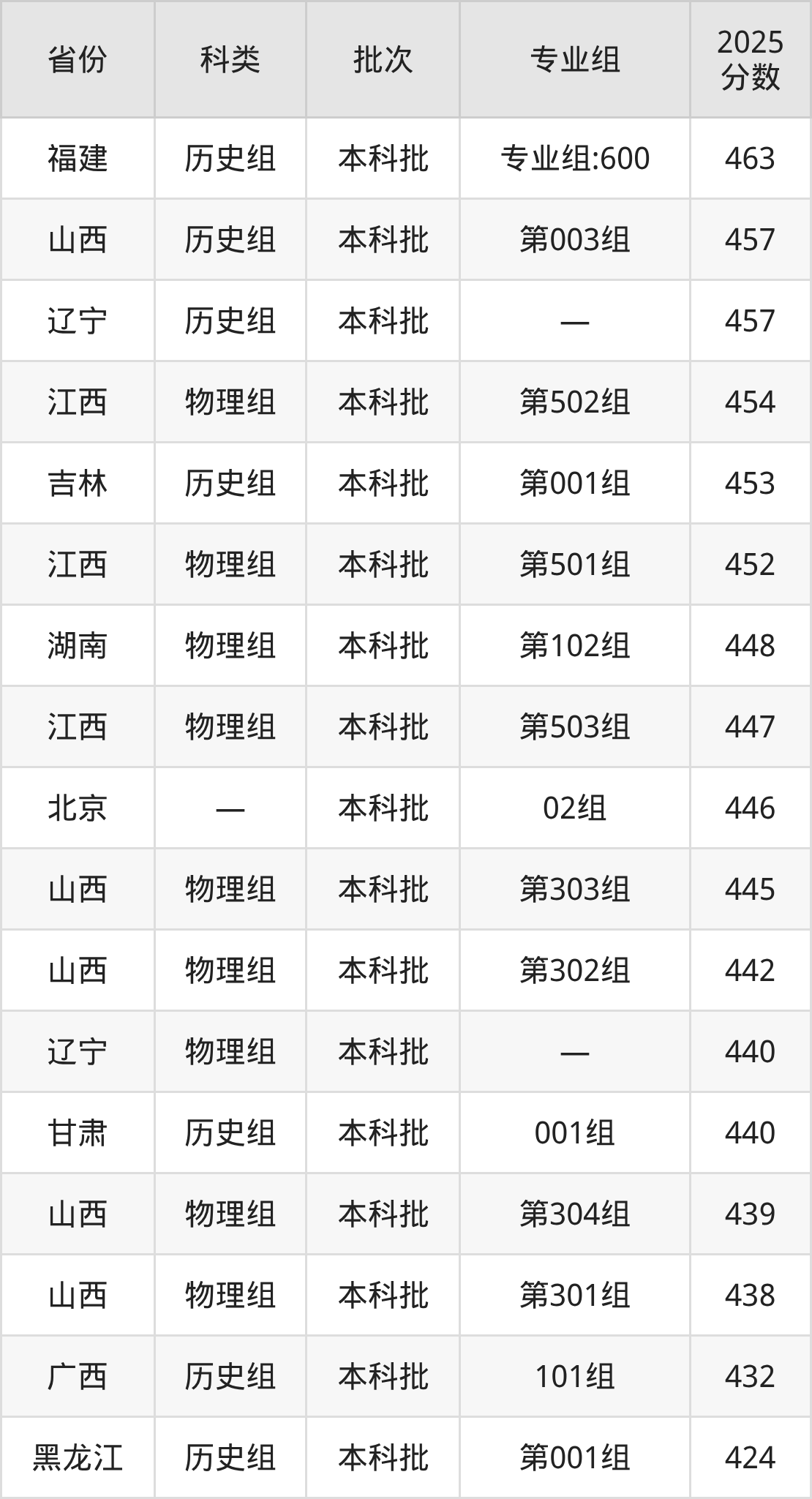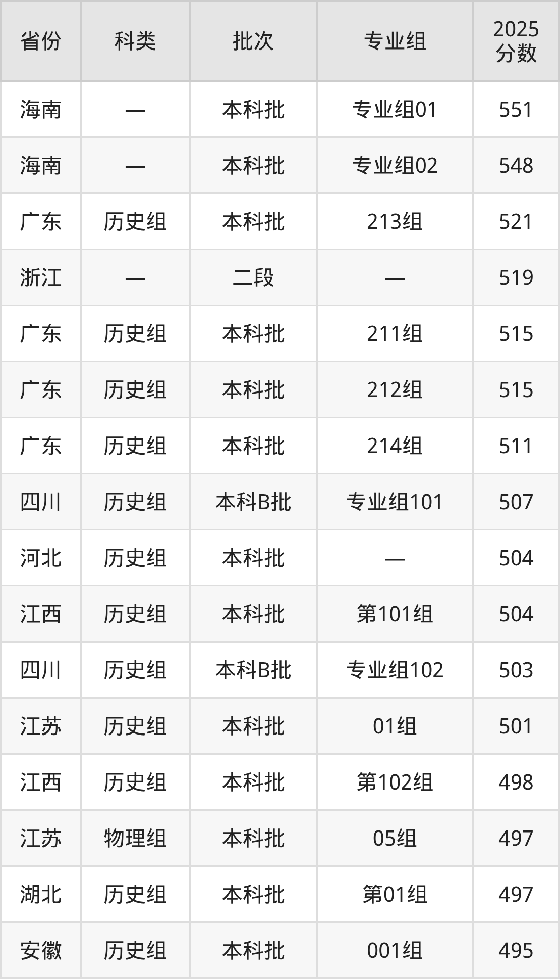 2025年江西农业大学南昌商学院在全国普通批次招生的录取分数范围位于389~551分之间,其中省内分数范围为447分~504分,历史组最低分专业组为“第102组”,考生498分即可报考,物理组最低分专业组为“第503组”,考生447分即可报考。