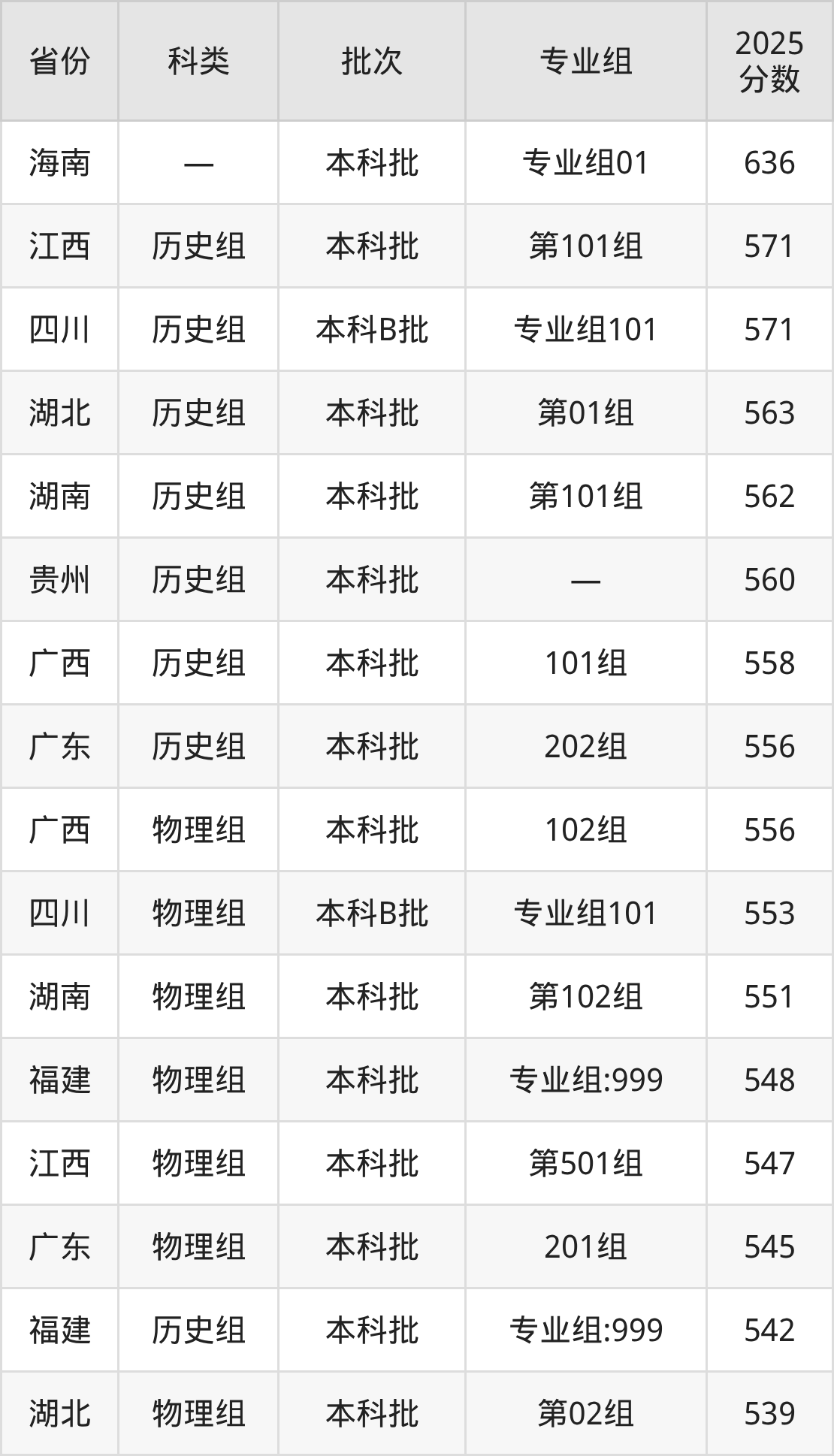 2025年广东警官学院在全国普通批次招生的录取分数范围位于532~636分之间,其中省内分数范围为545分~556分,历史组最低分专业组为“202组”,考生556分即可报考,物理组最低分专业组为“201组”,考生545分即可报考。