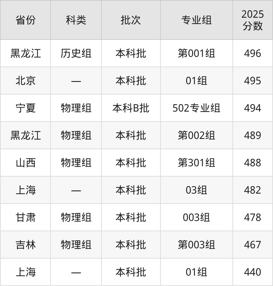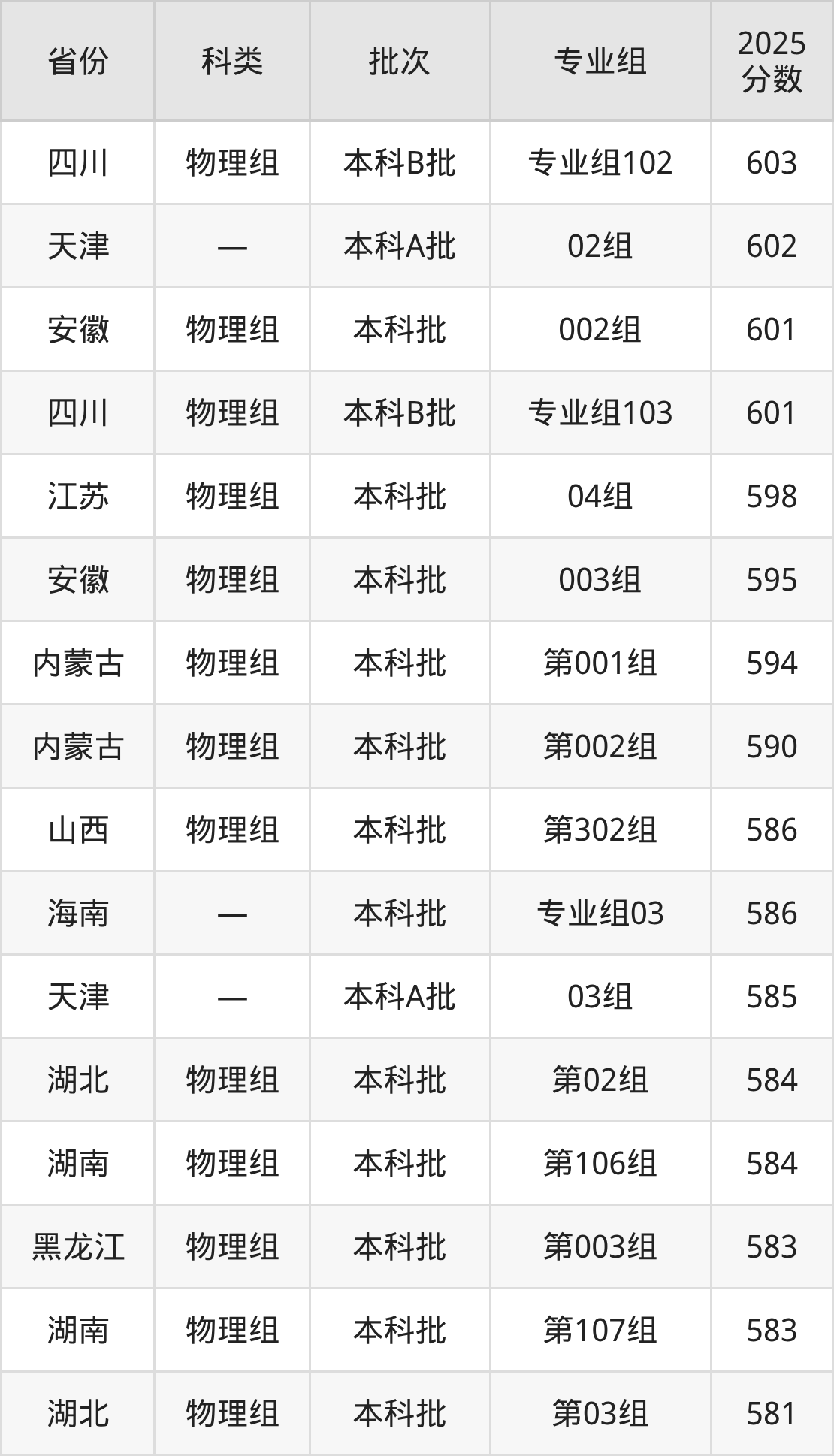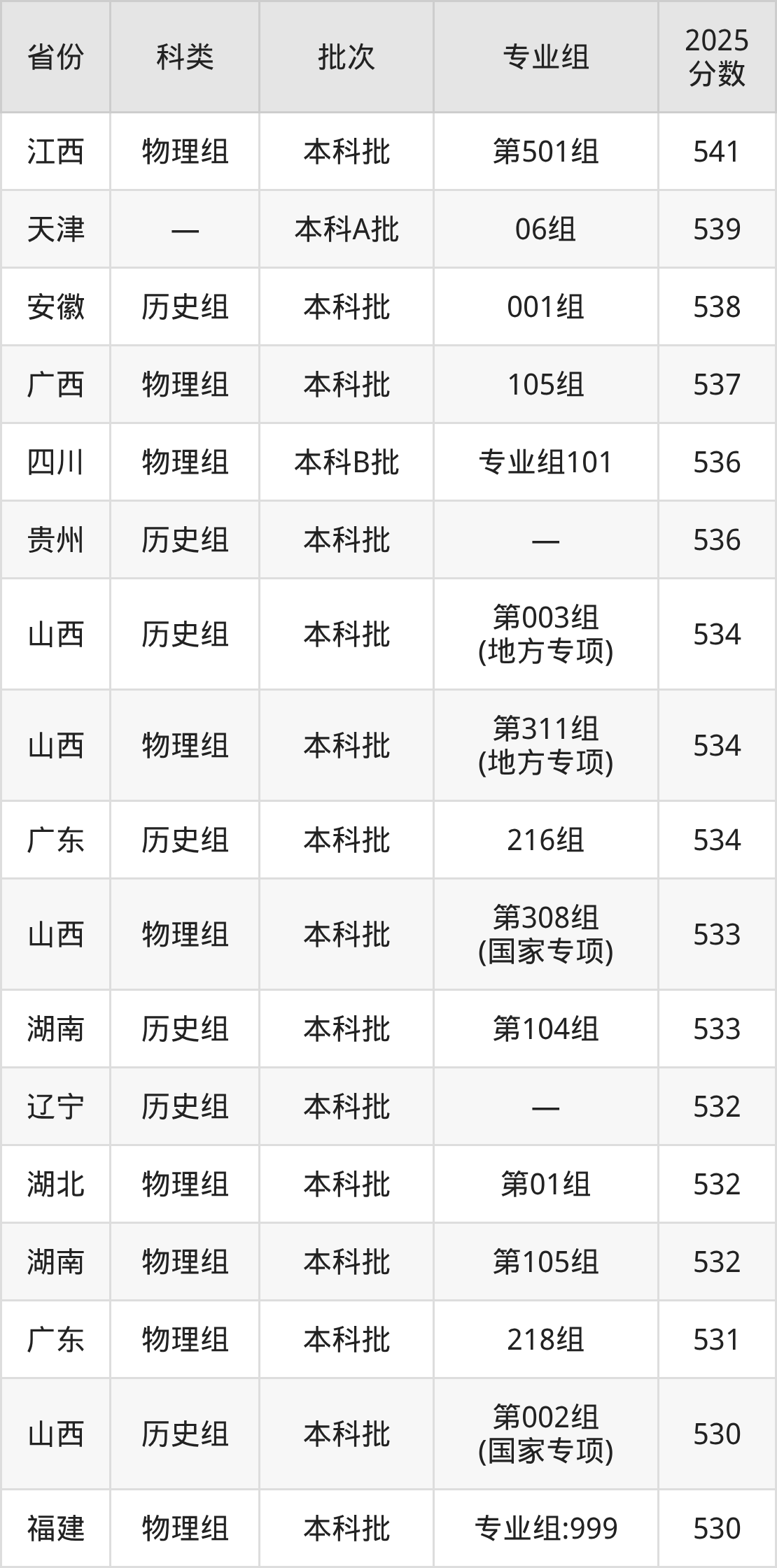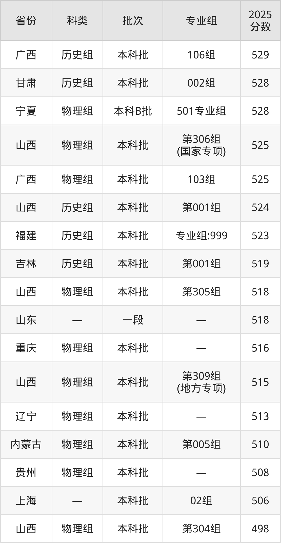 2025年中北大学在全国普通批次招生的录取分数范围位于440~603分之间,其中省内分数范围为488分~586分,物理组最低分专业组为“第301组”,考生488分即可报考,历史组最低分专业组为“第001组”,考生524分即可报考。