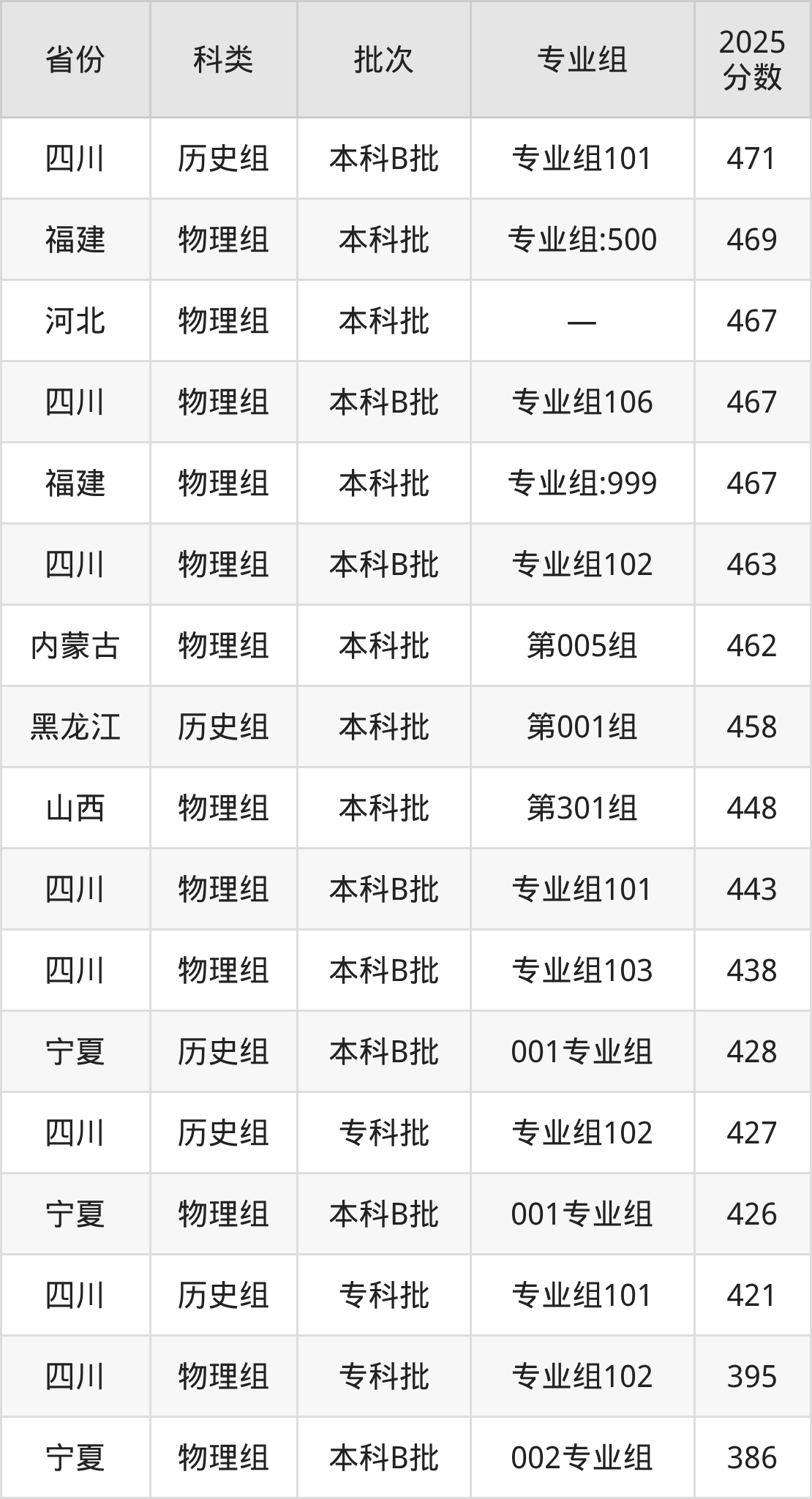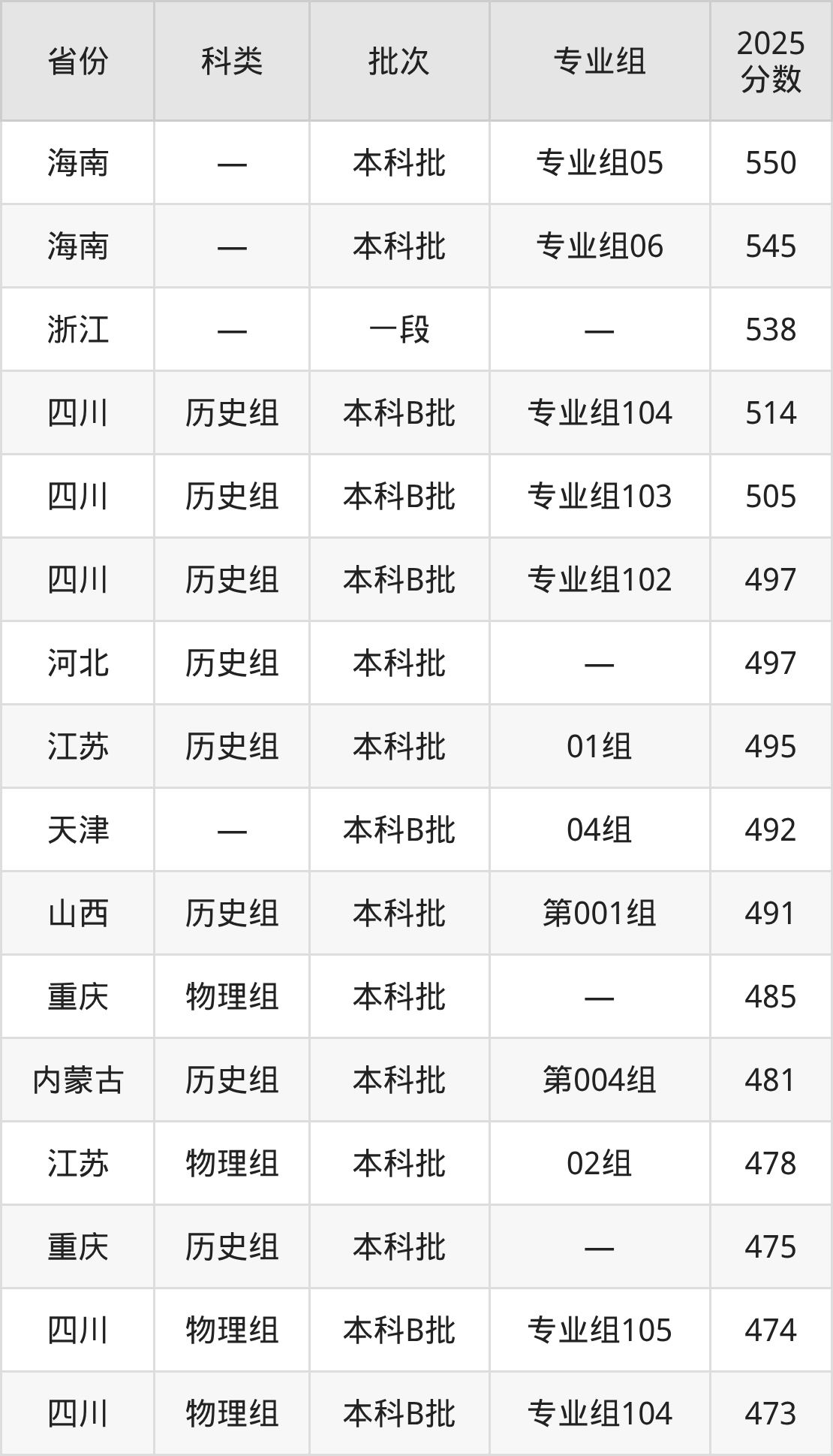 2025年成都文理学院在全国普通批次招生的录取分数范围位于218~550分之间,其中省内分数范围为382分~514分,历史组最低分专业组为“专业组101”,考生421分即可报考,物理组最低分专业组为“专业组101”,考生382分即可报考。