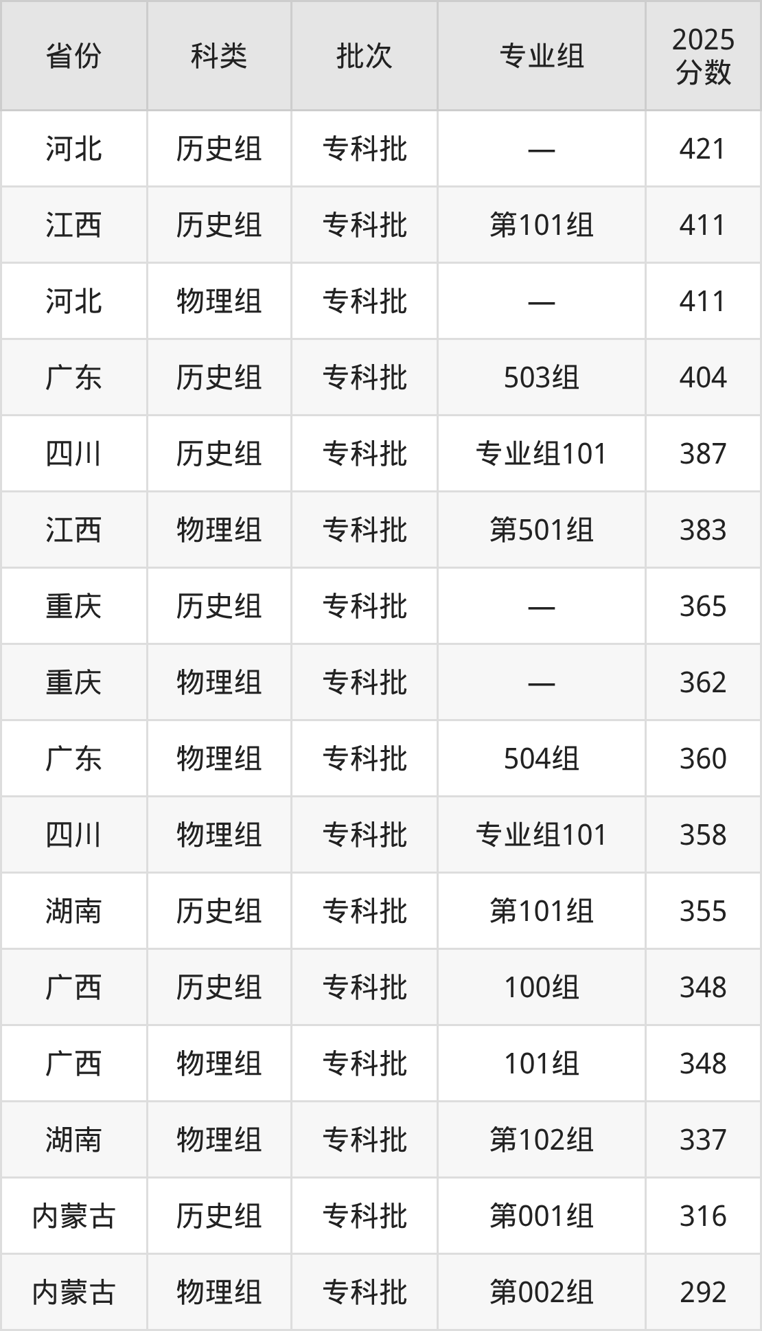 而河北地区历史组考生的分数门槛最高,2025年怀化职业技术学院在河北招生最低分为421分,考生至少要超专科线221分才有可能被录取。
