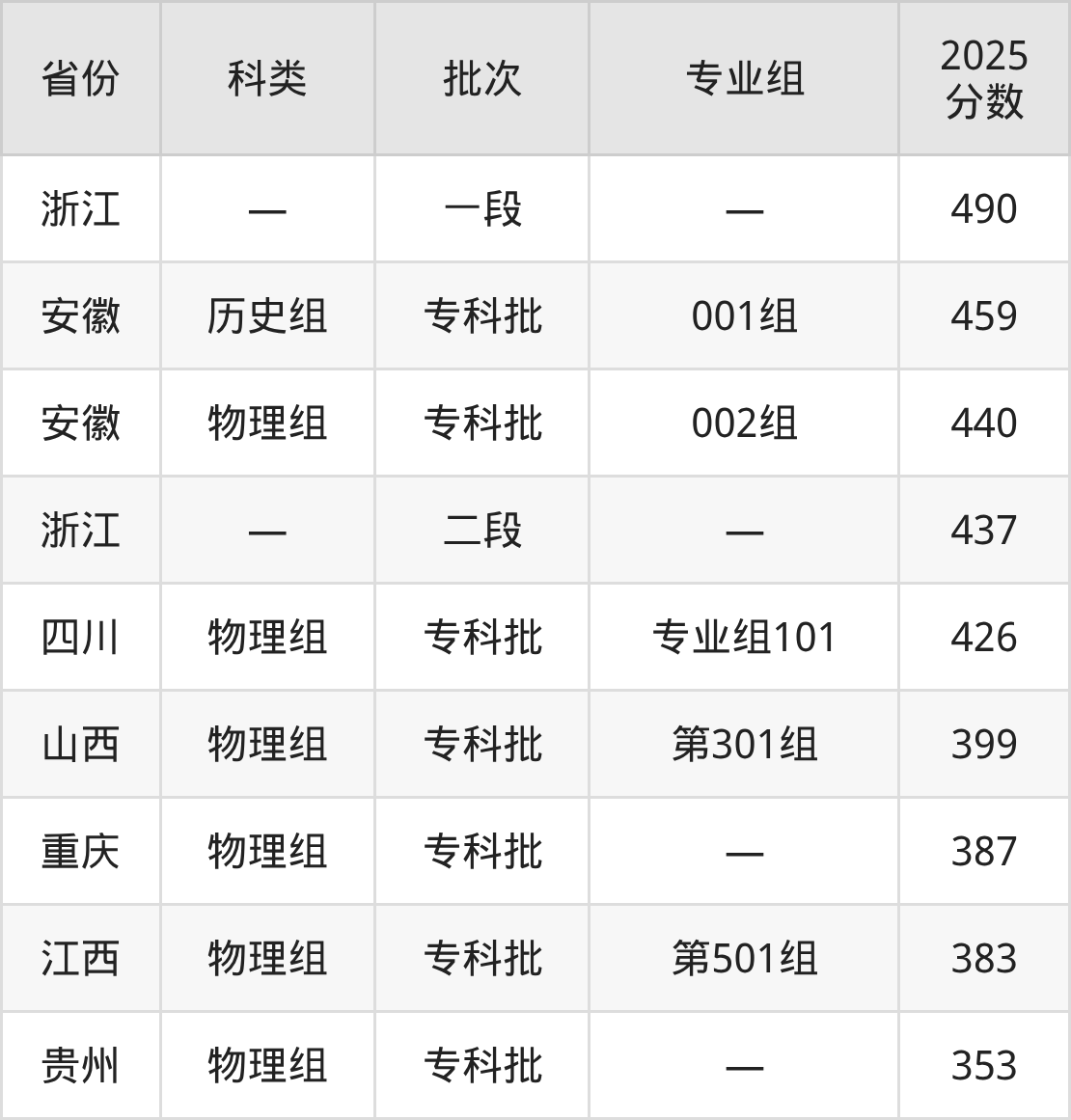 而浙江地区考生的分数门槛最高,2025年合肥职业技术学院在浙江招生最低分为490分,考生至少要超一段线0分才有可能被录取。