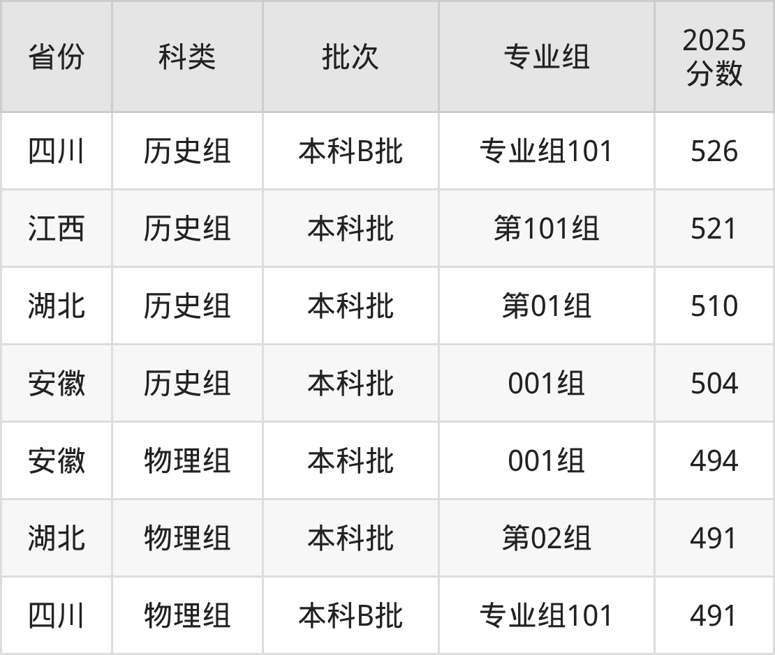 2025年安徽艺术学院在全国普通批次招生的录取分数范围位于491~526分之间,其中省内分数范围为494分~504分,历史组最低分专业组为“001组”,考生504分即可报考,物理组最低分专业组为“001组”,考生494分即可报考。