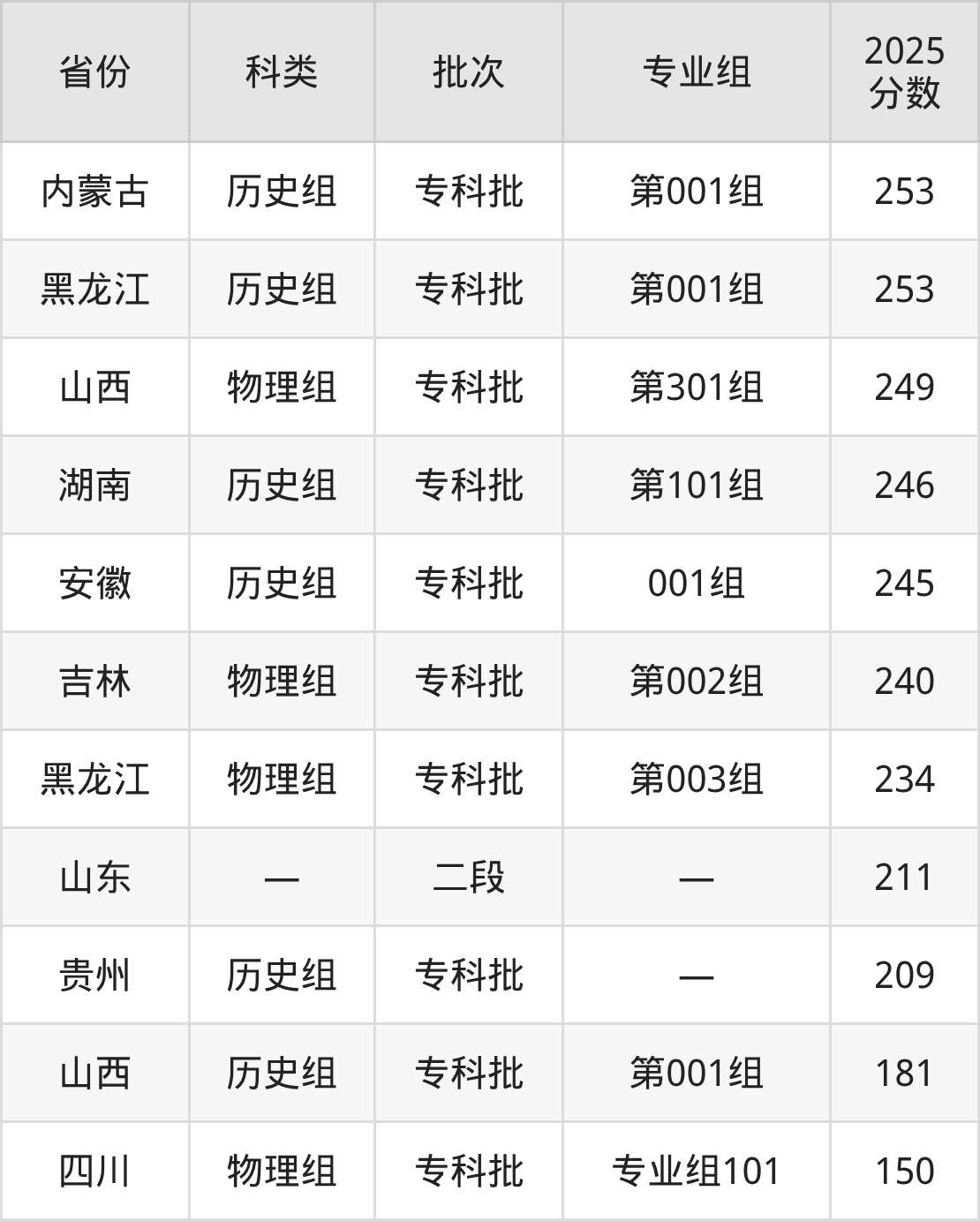 佳木斯职业学院在省外招生的最低分为150分,其中四川地区物理组考生上佳木斯职业学院的分数门槛最低,考生成绩达专科线即可报考。其次是山西历史组考生,上佳木斯职业学院至少要超专科线81分(181分)。