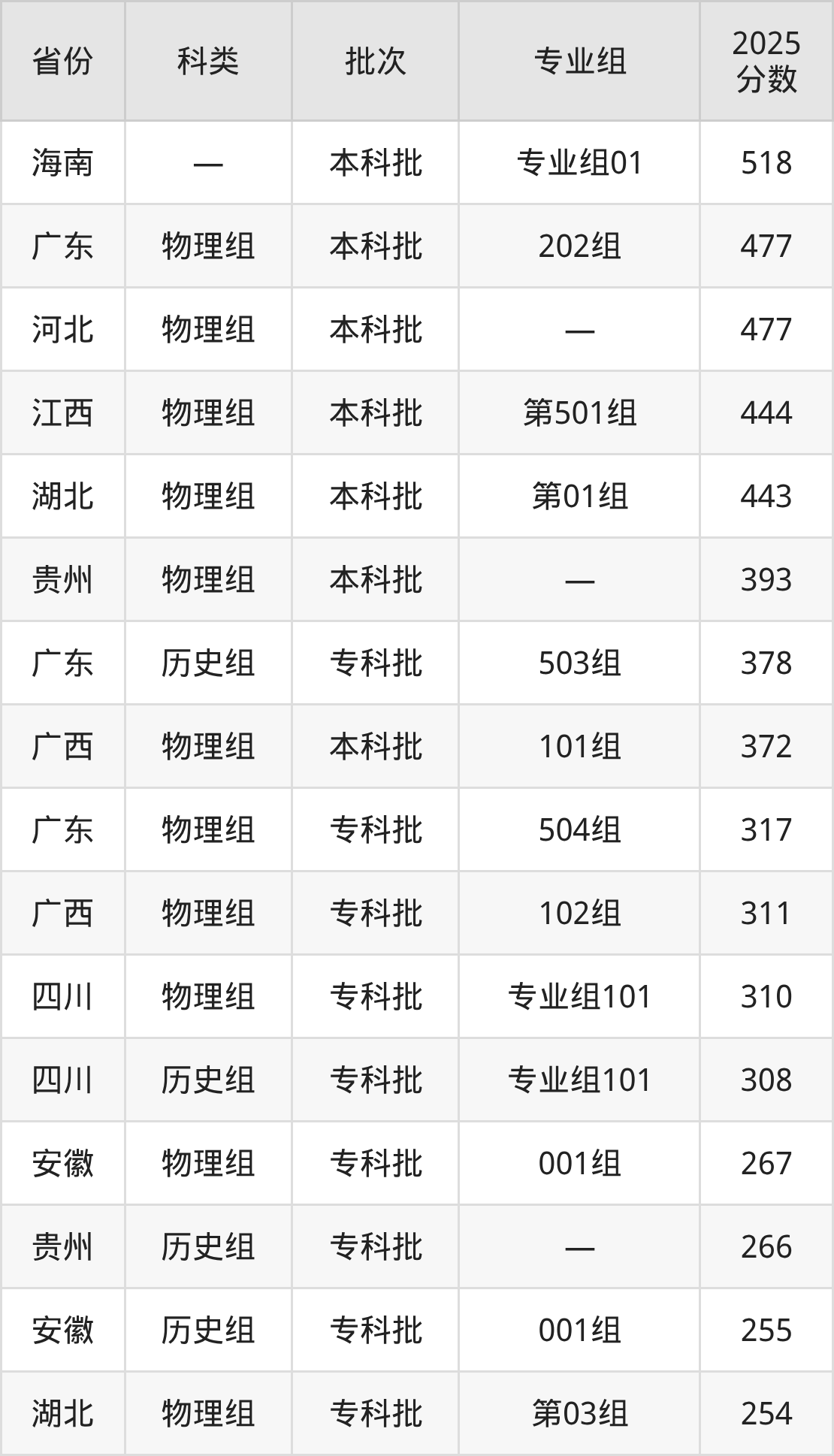 而海南地区考生的分数门槛最高,2025年湖南软件职业技术大学专业组01在海南招生最低分为518分,考生至少要超本科线38分才有可能被录取。
