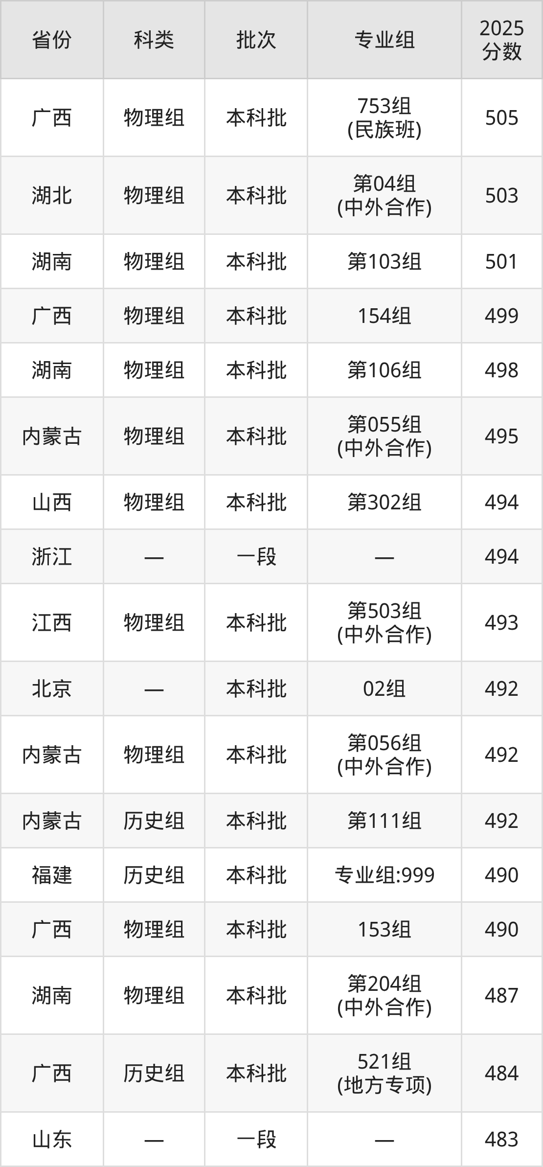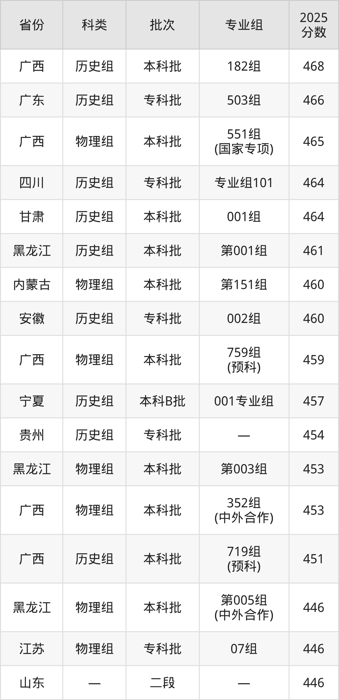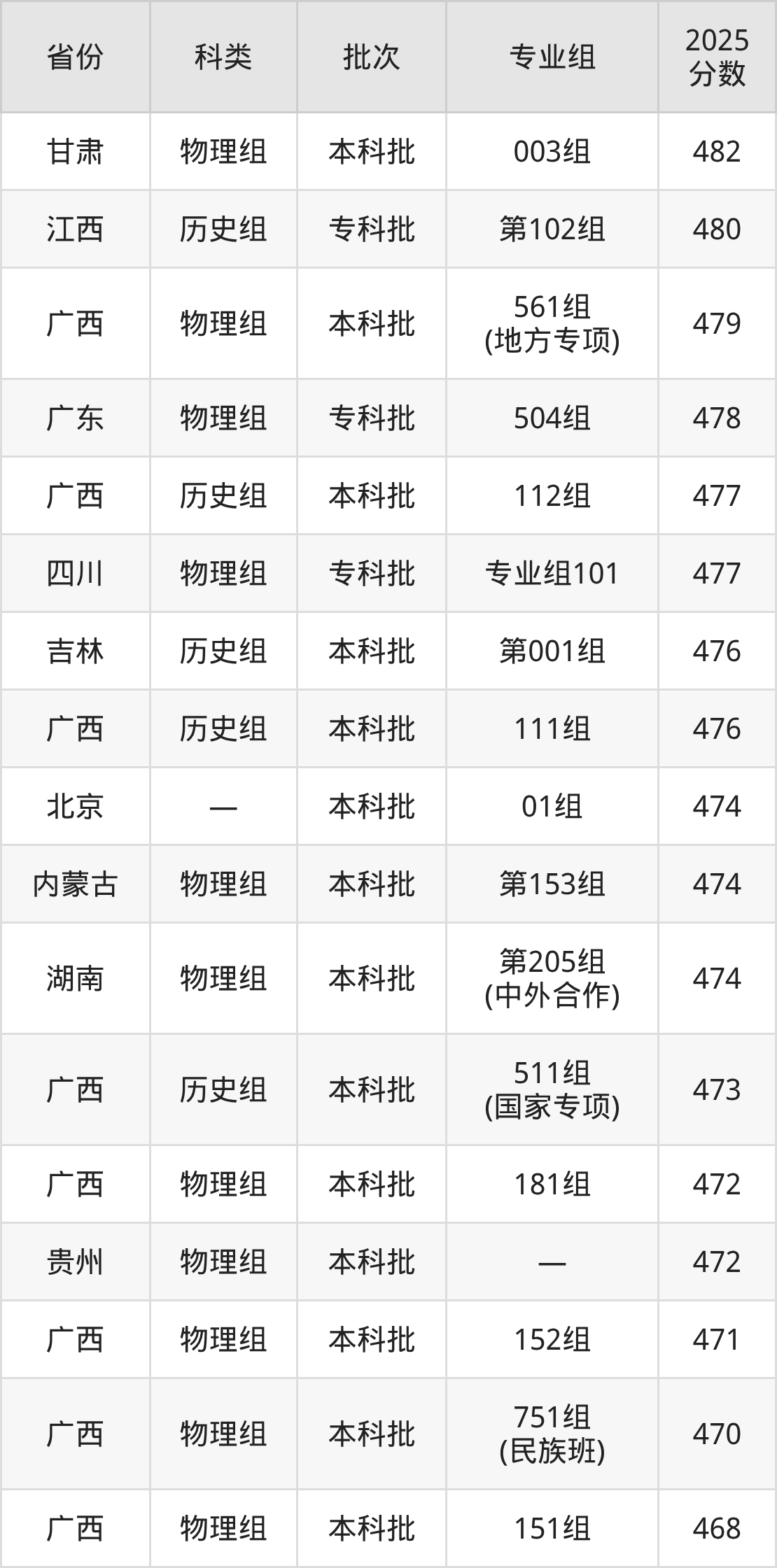 2025年桂林理工大学在全国普通批次招生的录取分数范围位于285~574分之间,其中壮族自治区内分数范围为355分~525分,物理组最低分专业组为“173组”,考生355分即可报考,历史组最低分专业组为“174组”,考生393分即可报考。
