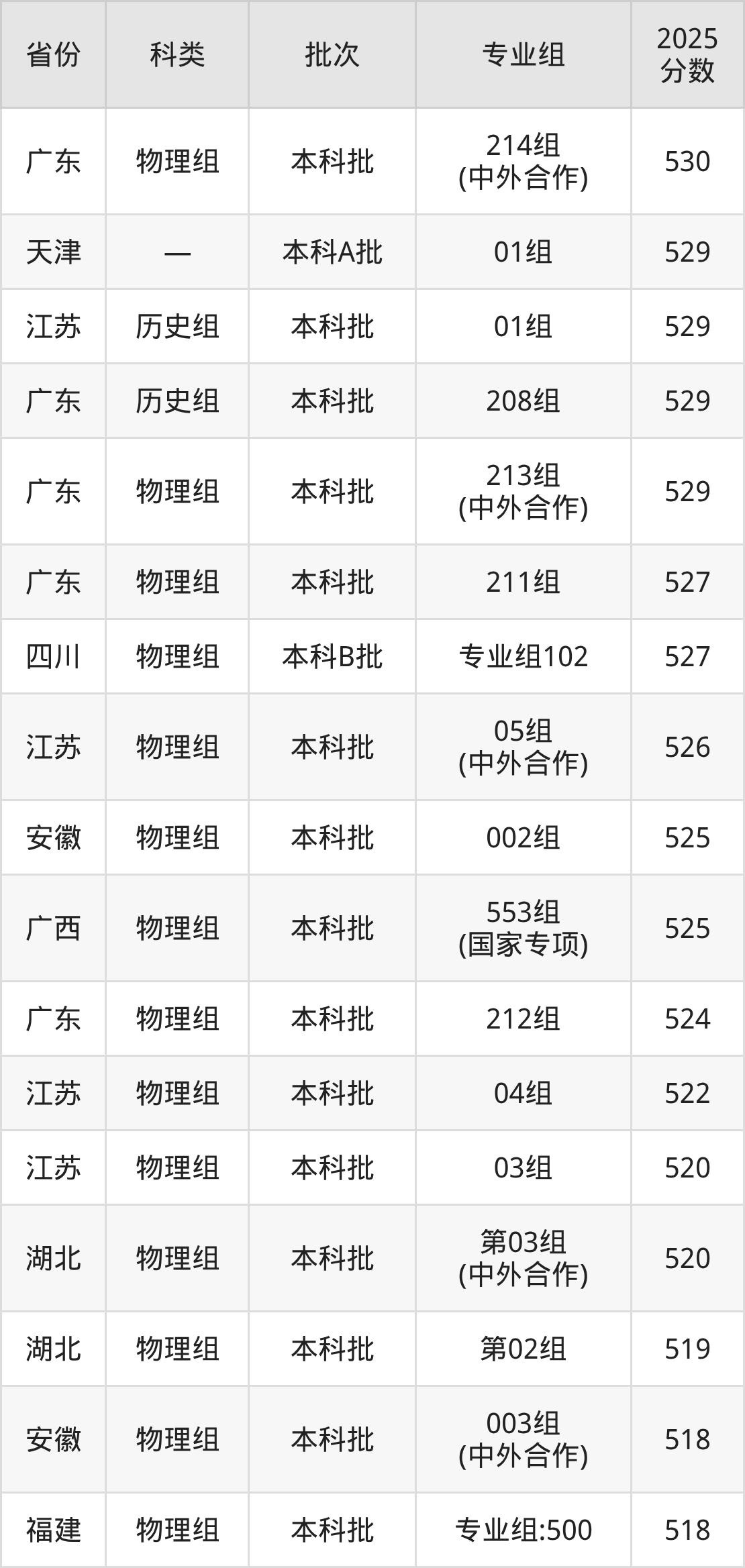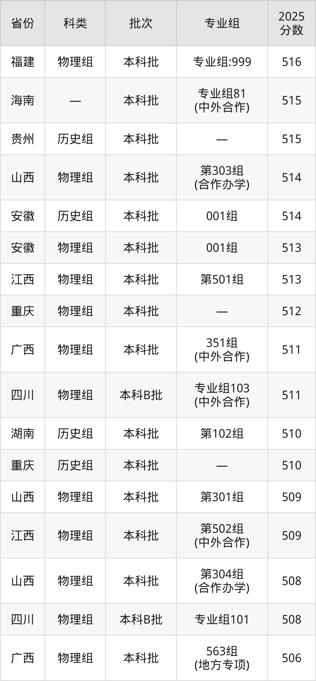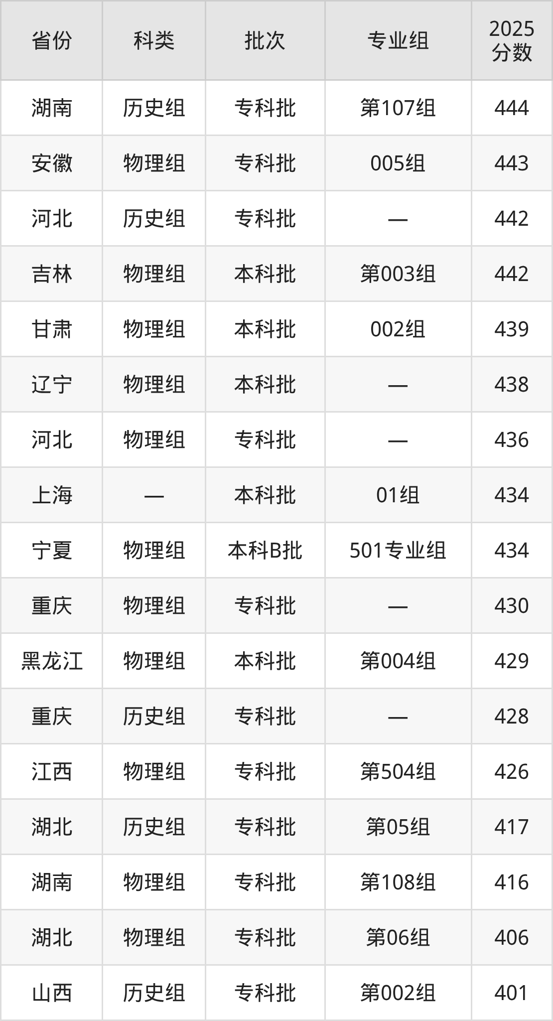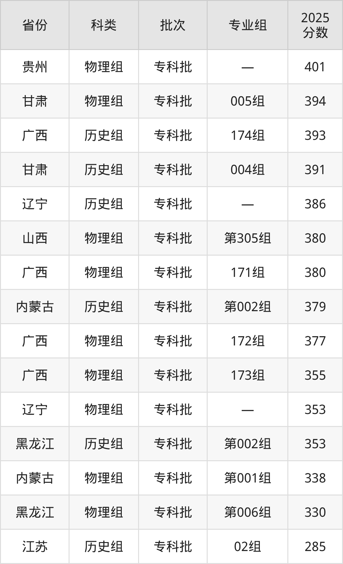 2025年桂林理工大学在全国普通批次招生的录取分数范围位于285~574分之间,其中壮族自治区内分数范围为355分~525分,物理组最低分专业组为“173组”,考生355分即可报考,历史组最低分专业组为“174组”,考生393分即可报考。