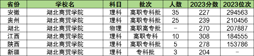 湖北商贸学院专科在新疆理科最低204分、江西理科最低308分。本期将为大家整理2023年湖北商贸学院各省专科分数线,以及2024年在各省的招生计划人数。