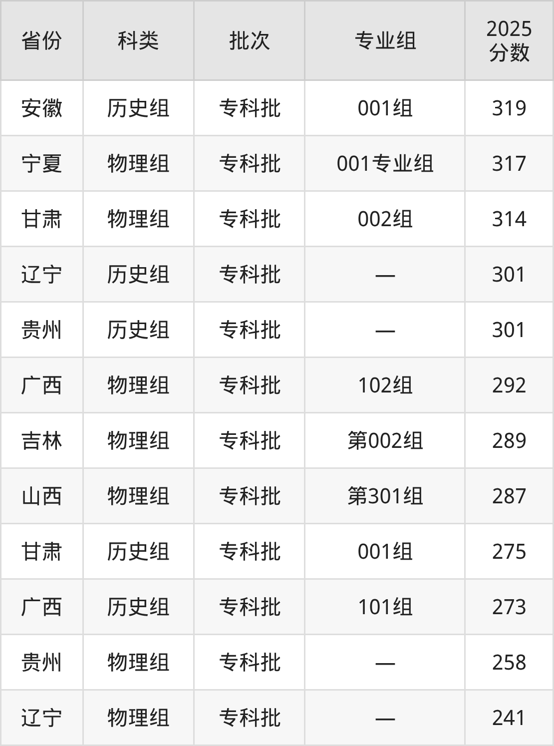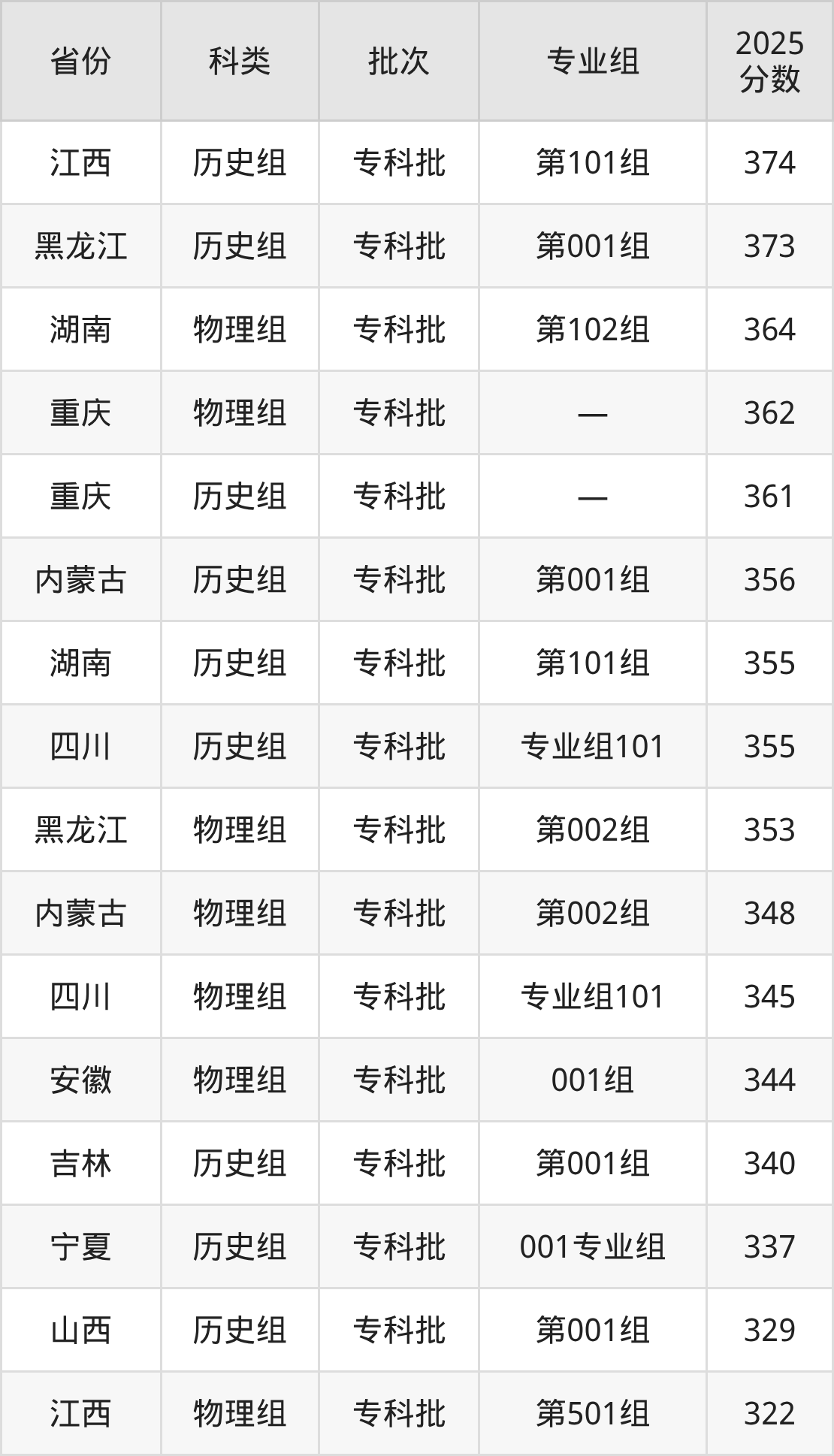 而江西地区历史组考生的分数门槛最高,2025年辽宁职业学院第101组在江西招生最低分为374分,考生至少要超专科线84分才有可能被录取。