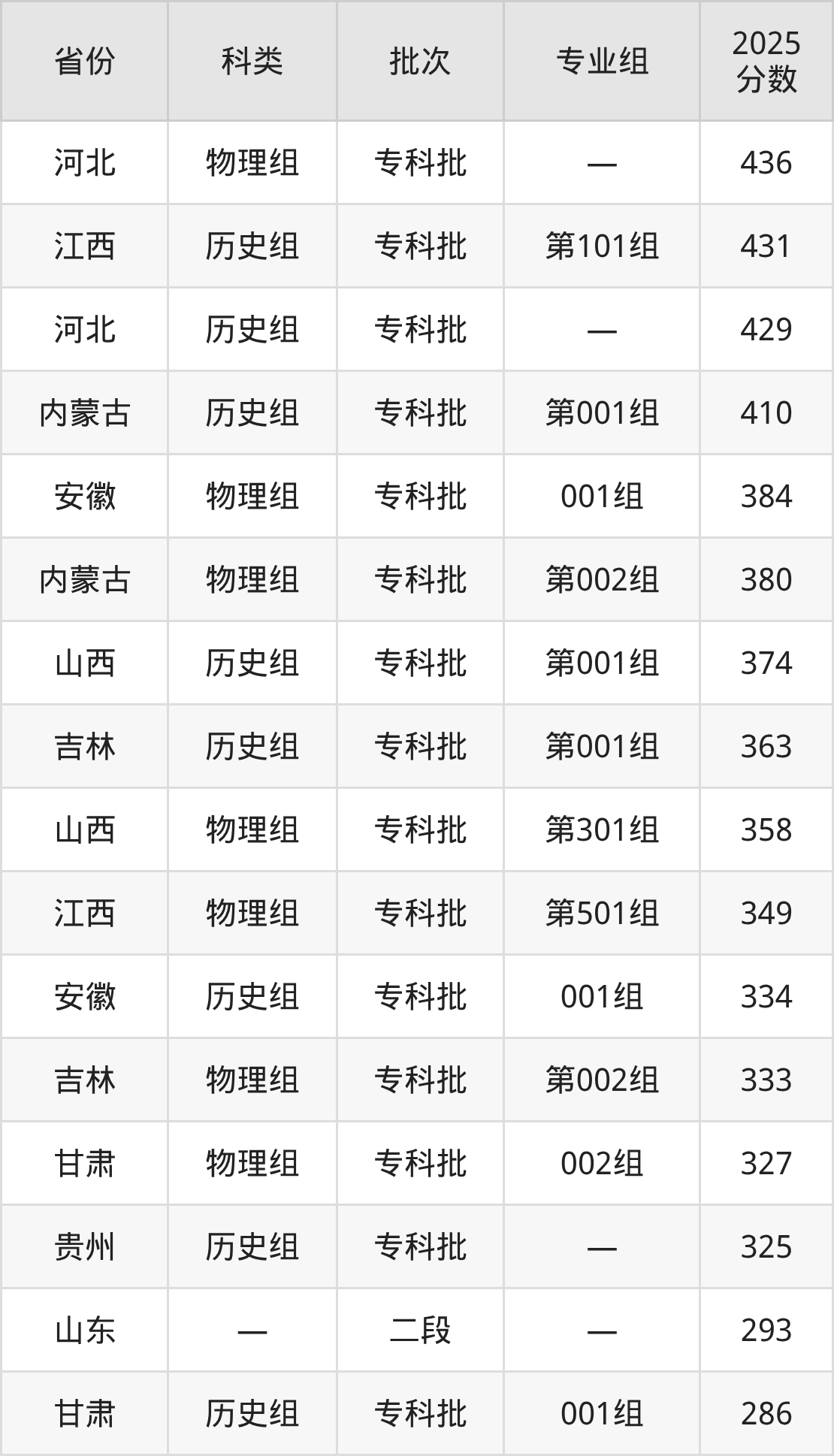 而河北地区物理组考生的分数门槛最高,2025年济宁职业技术学院在河北招生最低分为436分,考生至少要超专科线236分才有可能被录取。
