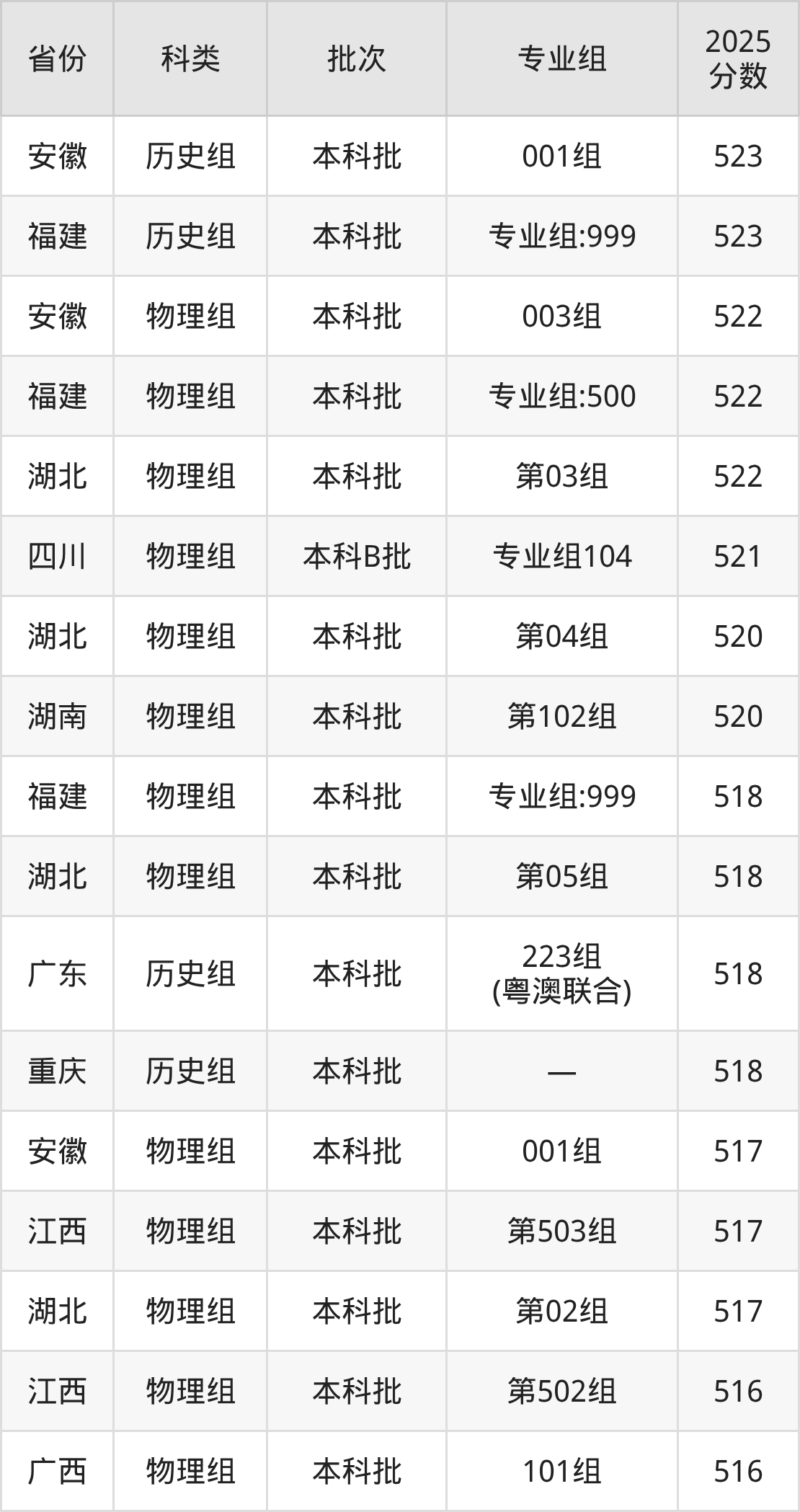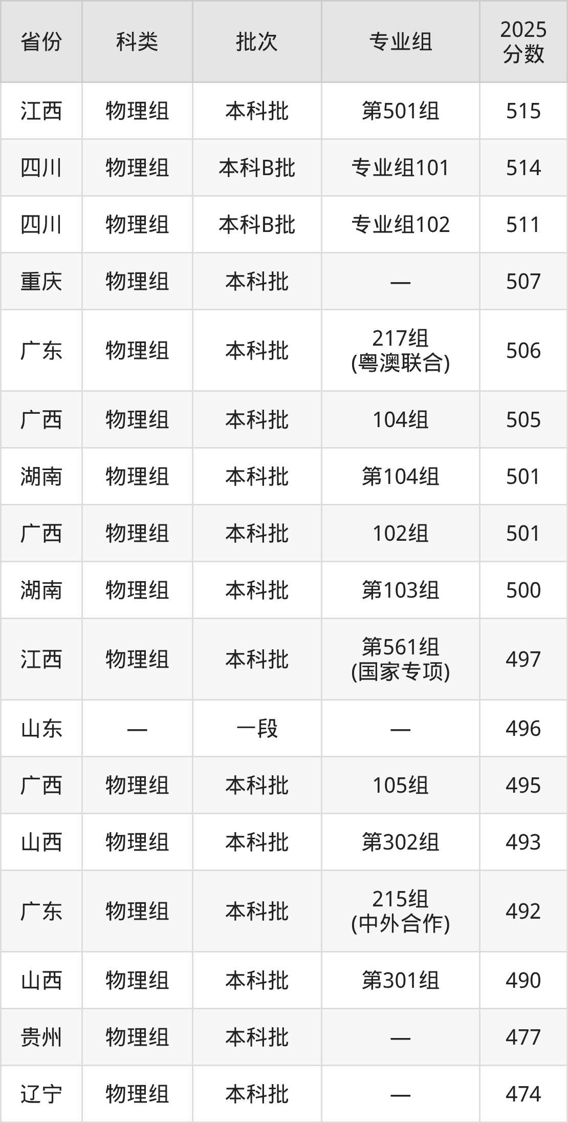 2025年佛山大学在全国普通批次招生的录取分数范围位于457~597分之间,其中省内分数范围为492分~563分,历史组最低分专业组为“223组(粤澳联合)”,考生518分即可报考,物理组最低分专业组为“215组(中外合作)”,考生492分即可报考。