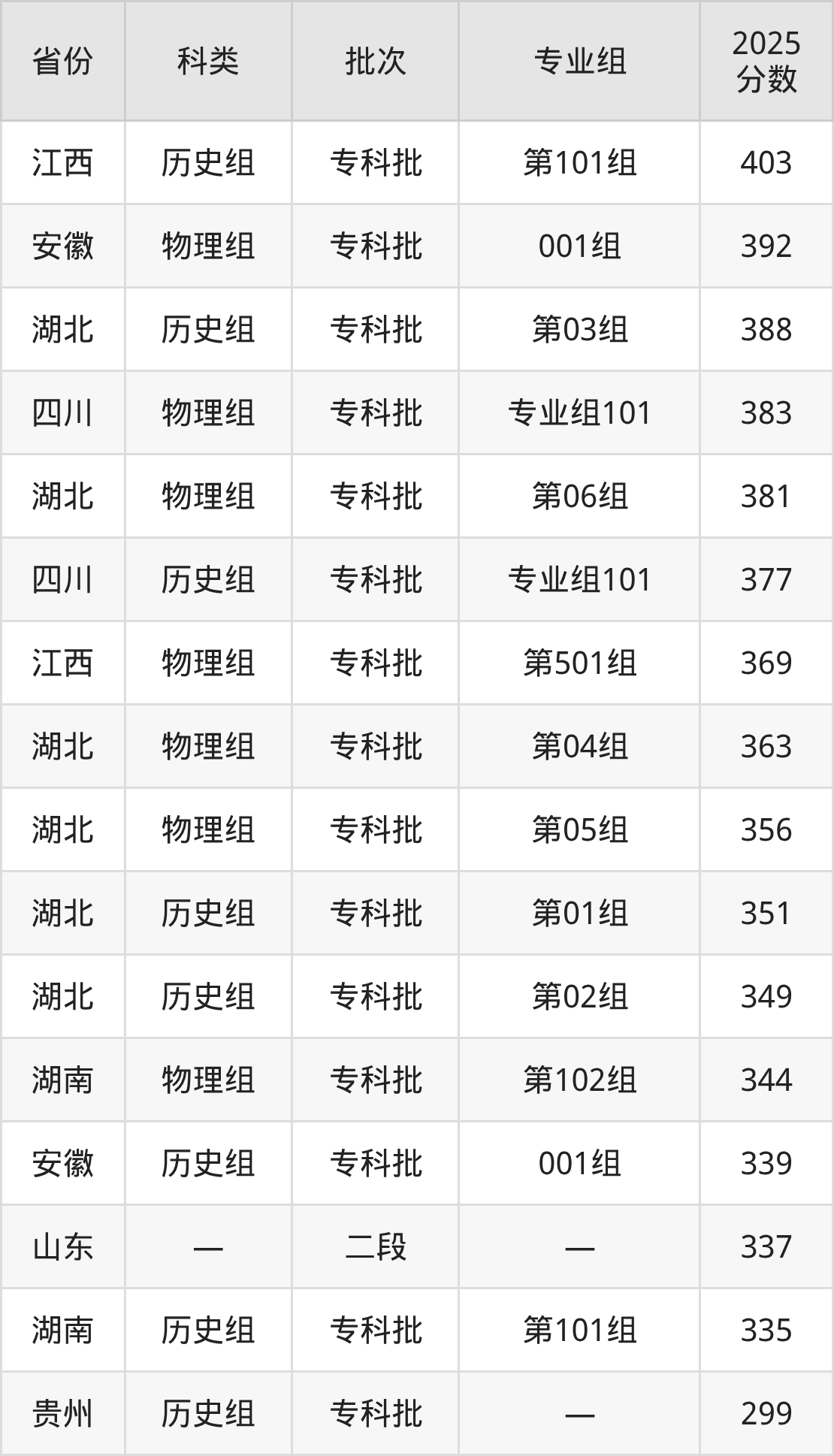 而江西地区历史组考生的分数门槛最高,2025年襄阳科技职业学院第101组在江西招生最低分为403分,考生至少要超专科线113分才有可能被录取。