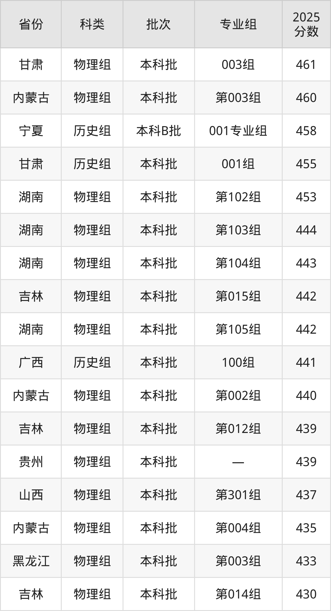 2025年吉林工商学院在全国普通批次招生的录取分数范围位于411~551分之间,其中省内分数范围为411分~508分,物理组最低分专业组为“第011组”,考生411分即可报考,历史组最低分专业组为“第007组”,考生461分即可报考。